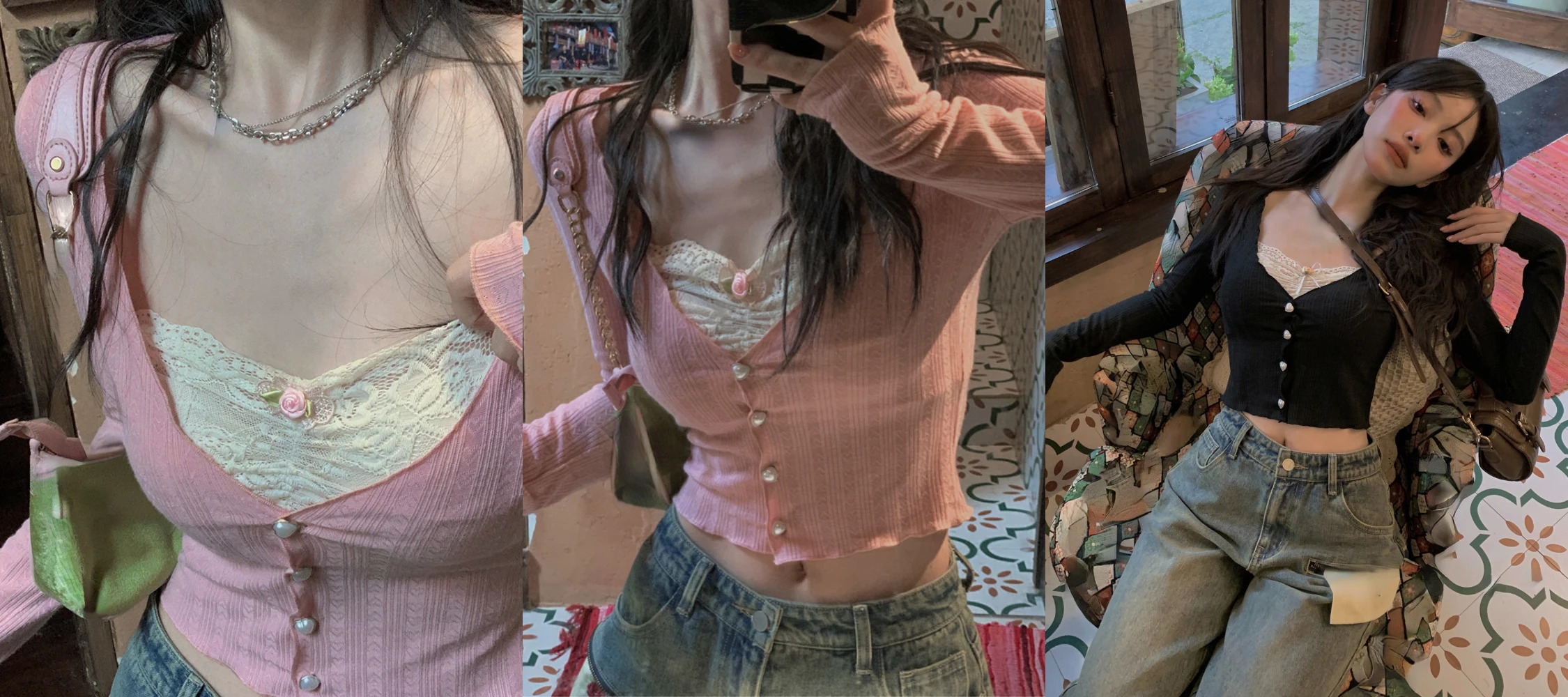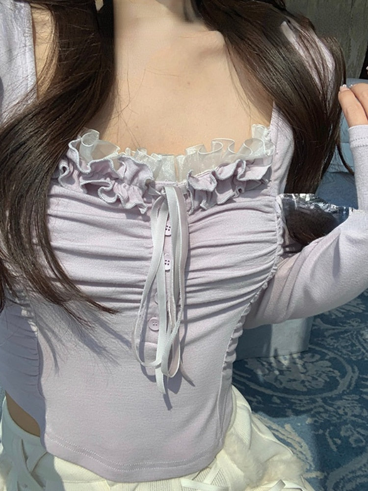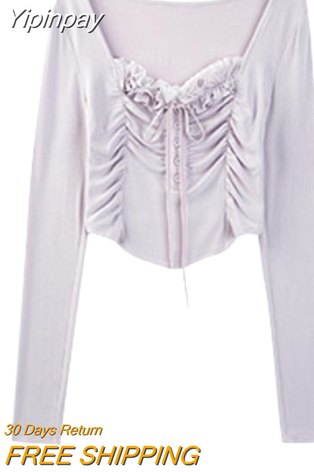 Yipinpay Spring Basic Lace Y2k Crop Tops Woman Slim Pure Color Korean T-shirt Office Lady Casual Fashion Clothing Female Design