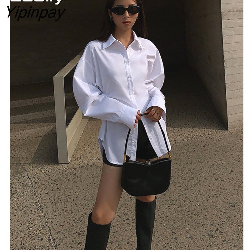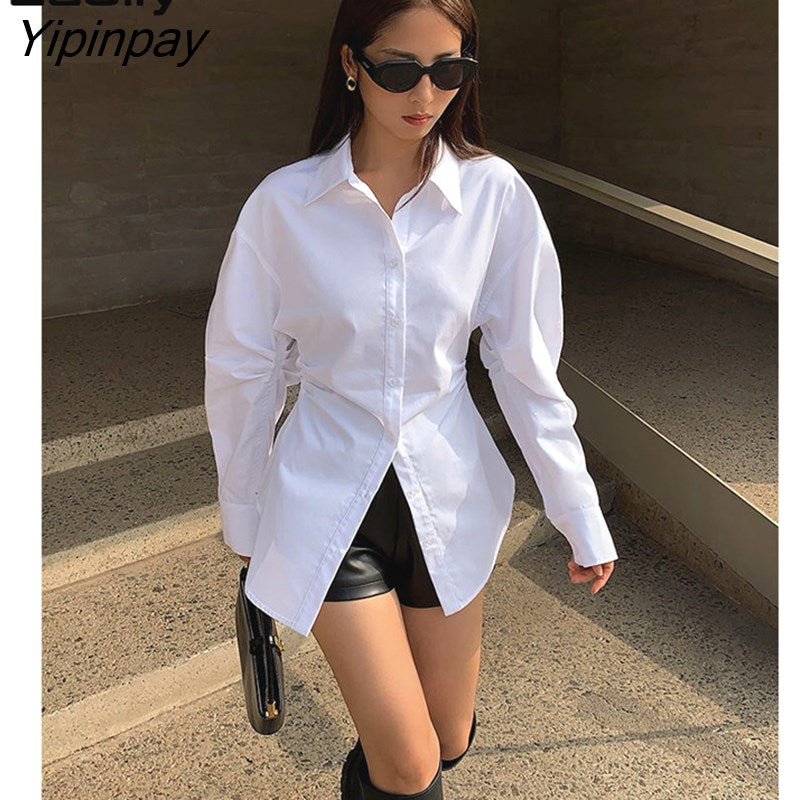 Yipinpay Spring Streetwear Full Sleeve Women Long Shirt Folds Slim Button White Ladies Blouse Free Shipping Female Shirts Clothe Top
