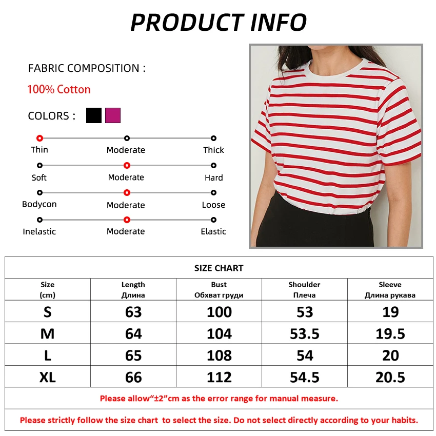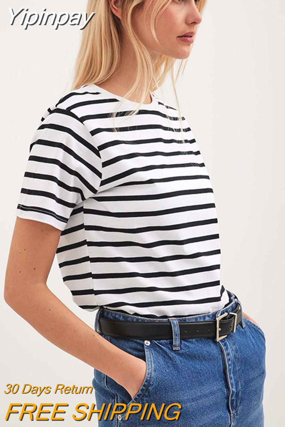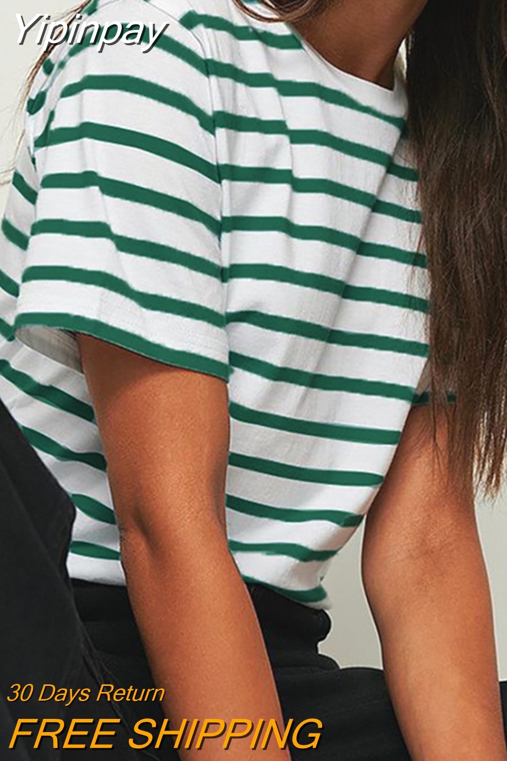 Yipinpay Street Women Stripe Basic Tee Shirts O-Neck Casual Print Loose Cotton Tops Short Sleeve Summer 2023 Fashion T-Shirt