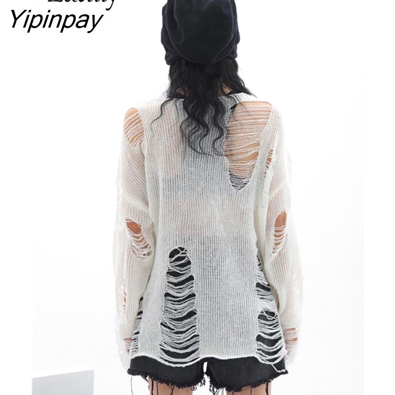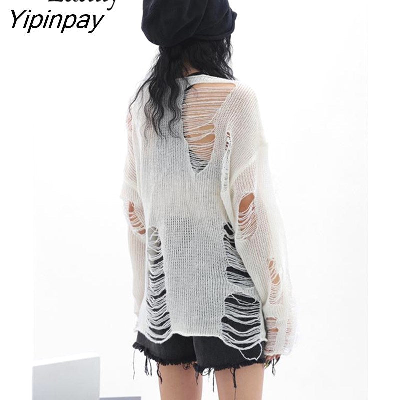 Yipinpay Streetwear Frayed Sweater Women Oversize Long Sleeve Knit Ladies Pullover Loose 2023 Autumn Female Loose Clothing Tops