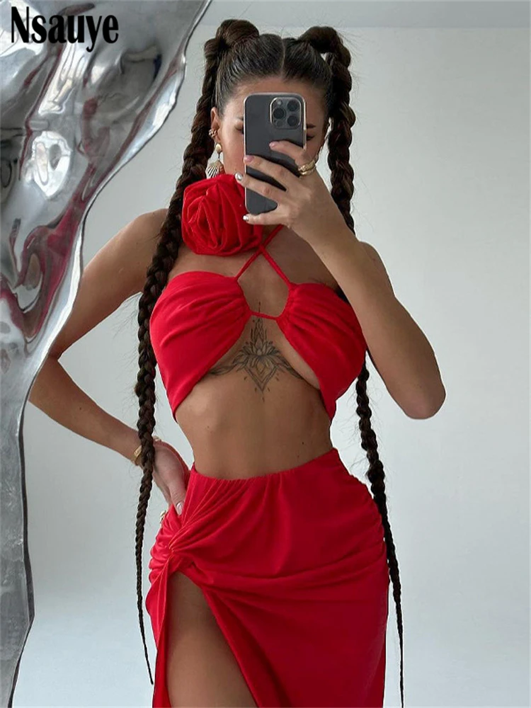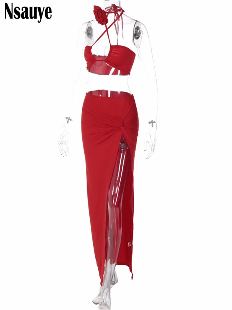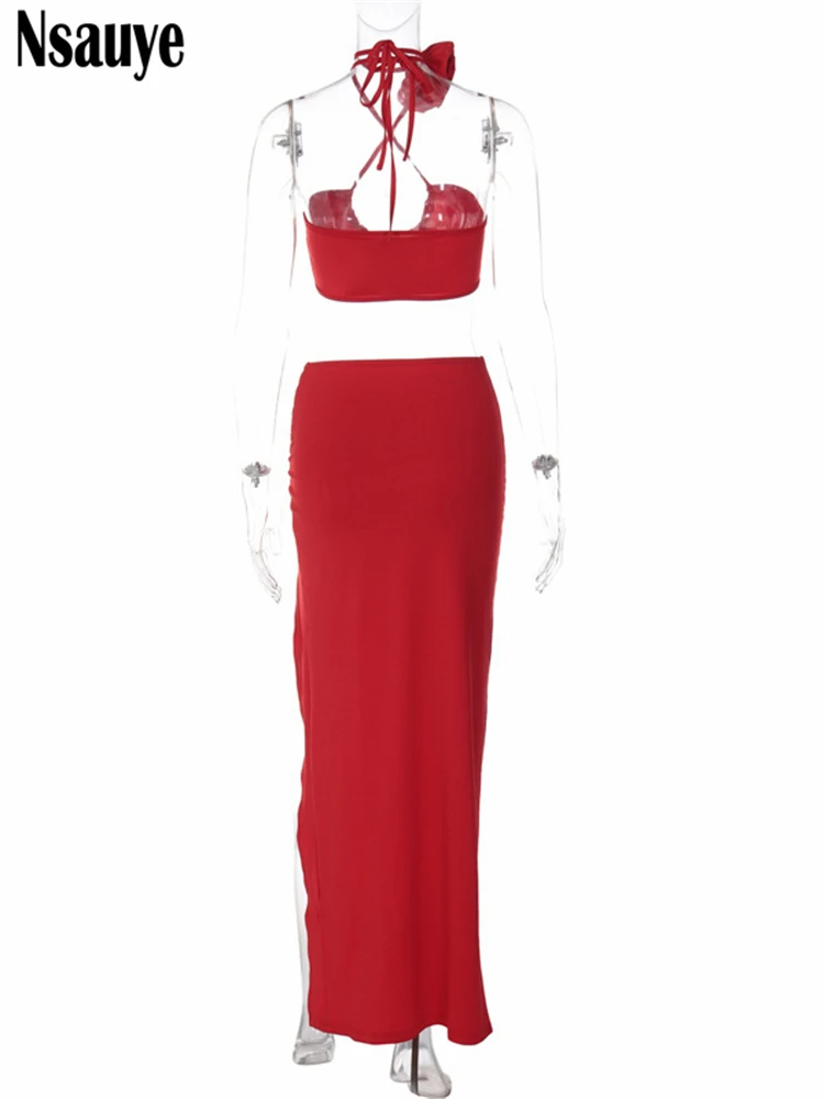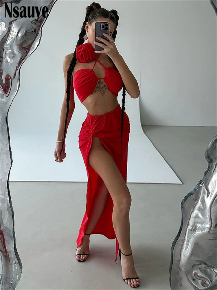 yipinpay Summer Casual Beach Holiday High Split Sexy Skirt Suit Women Halter Crop Tops Long Fashion Club Party Skirt Two Piece Set