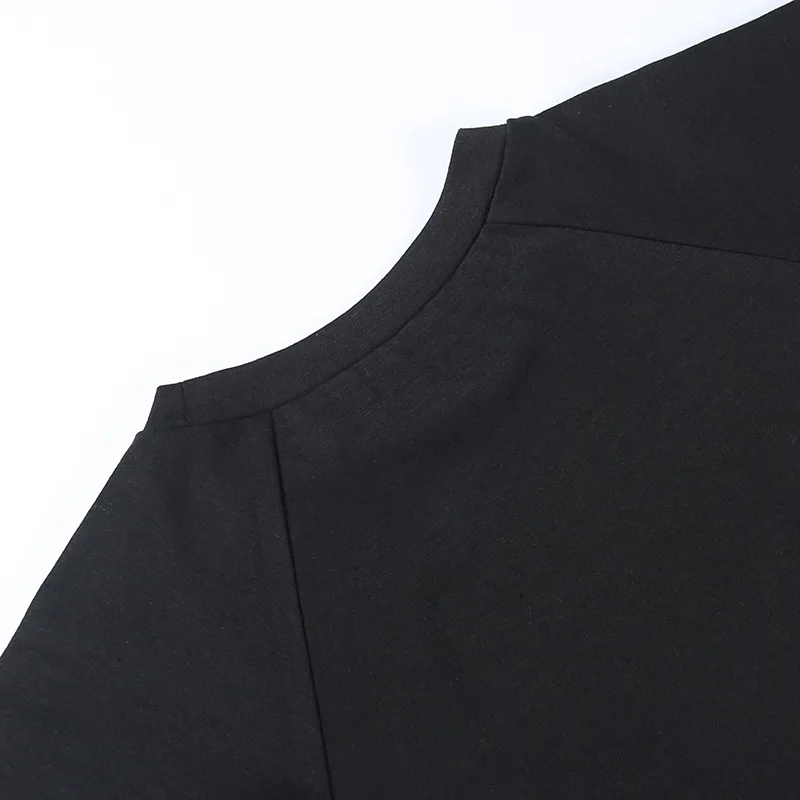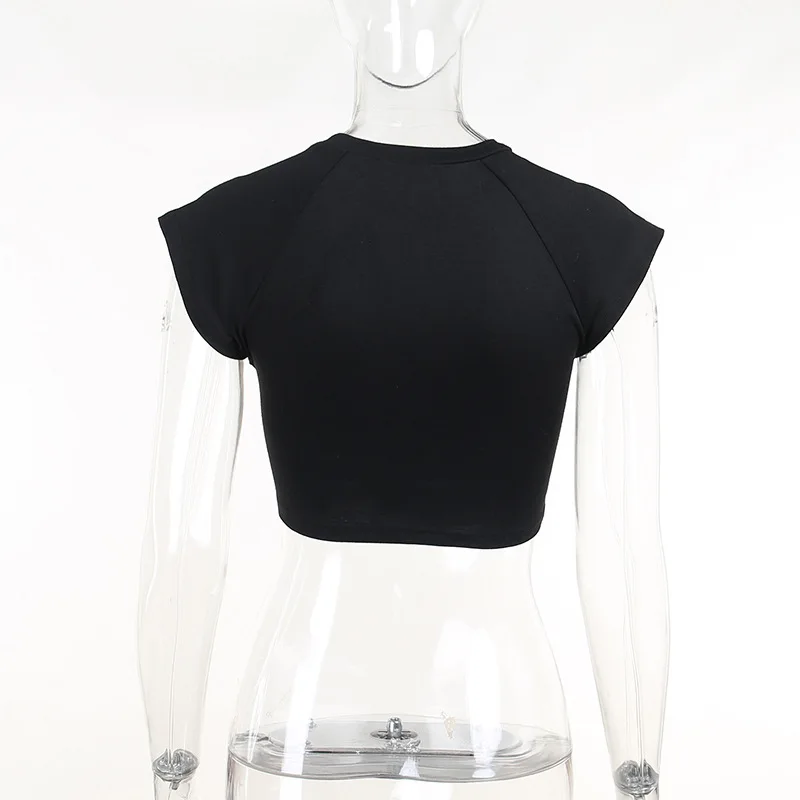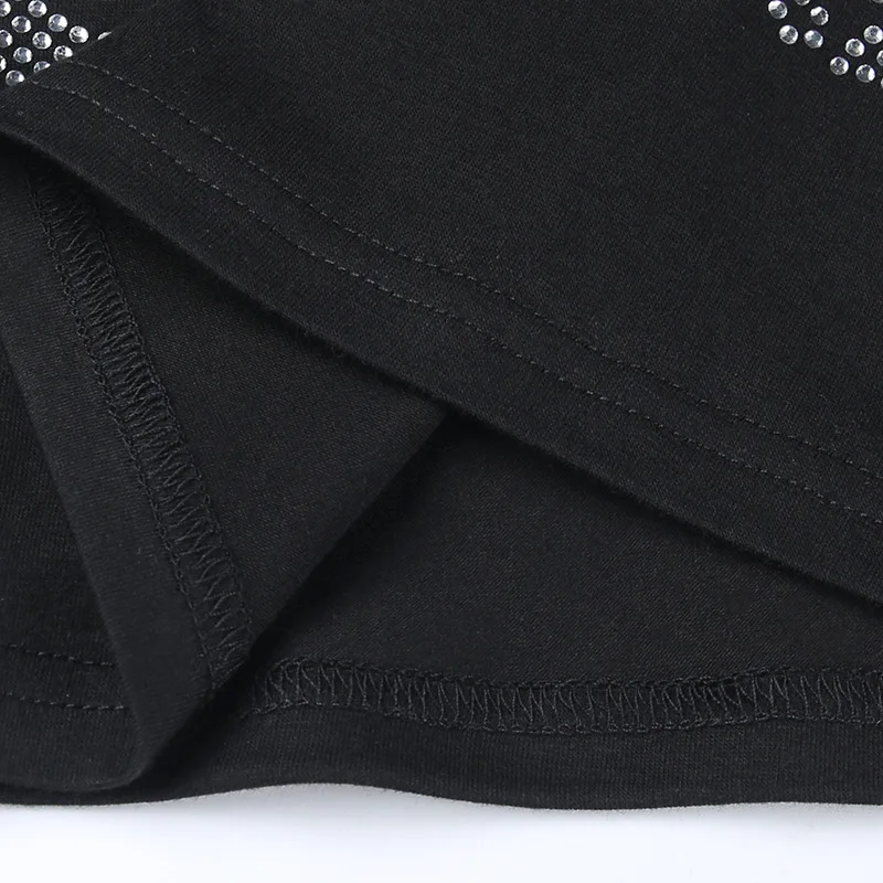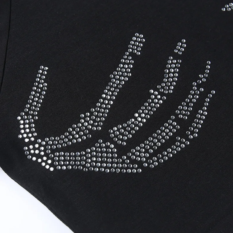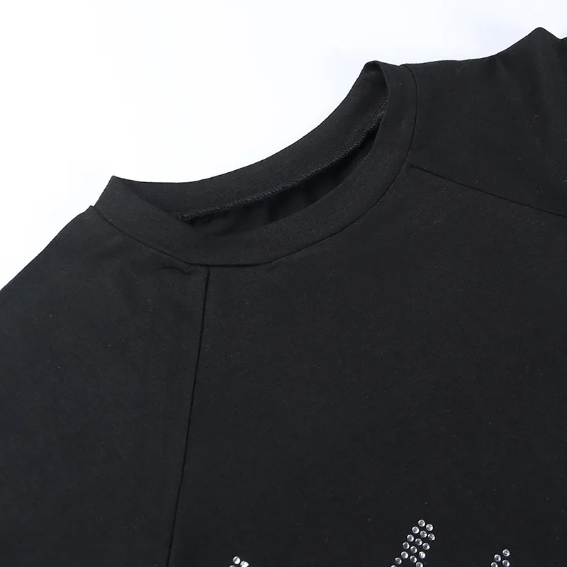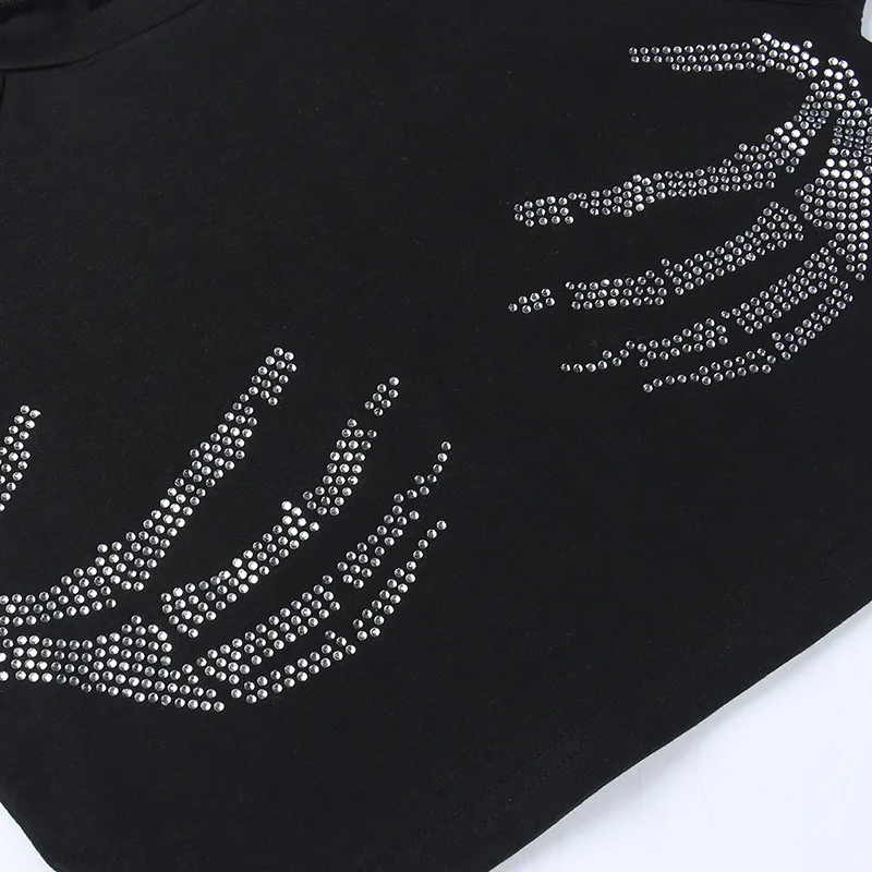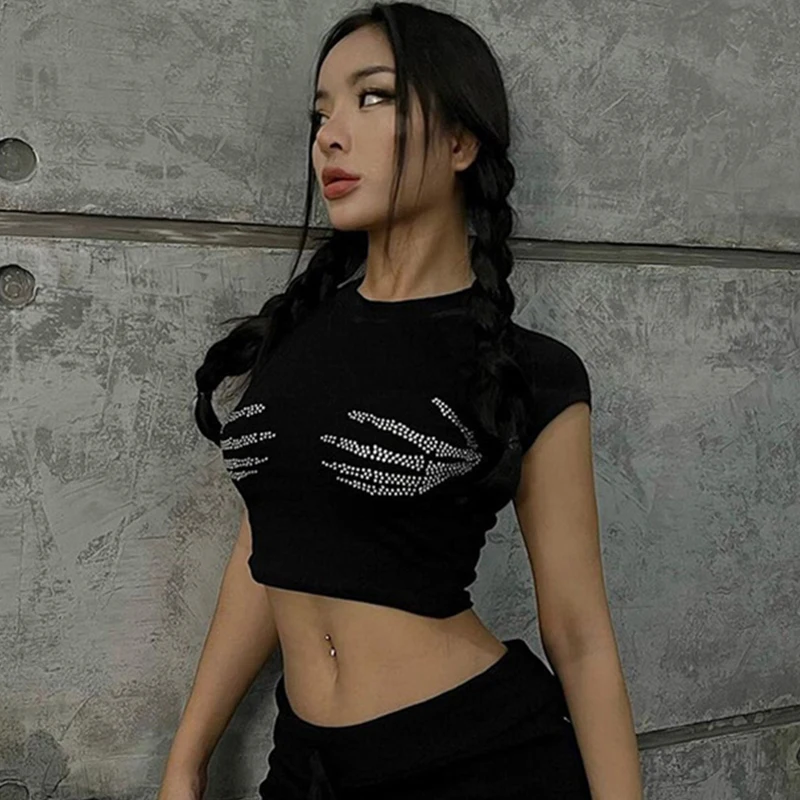 yipinpay T-Shirt Rhinestone Tops Women Cotton T-Shirt O Neck Crop Top Summer Tees Basic Casual Punk Grunge Streetwear Black Top