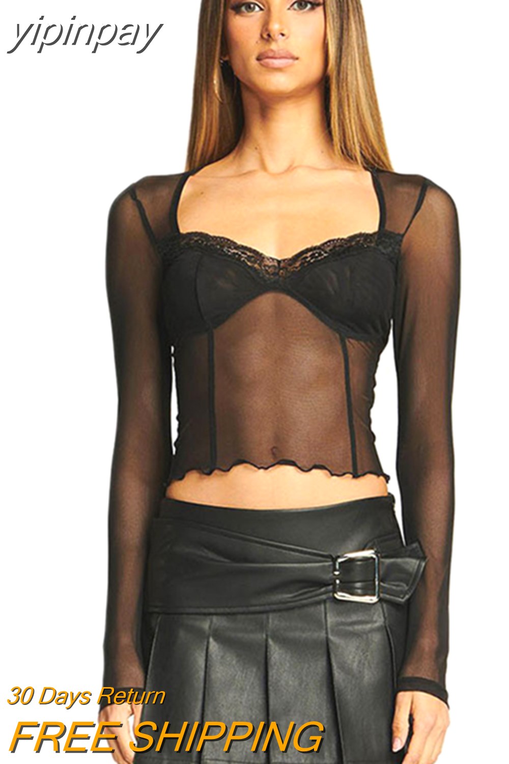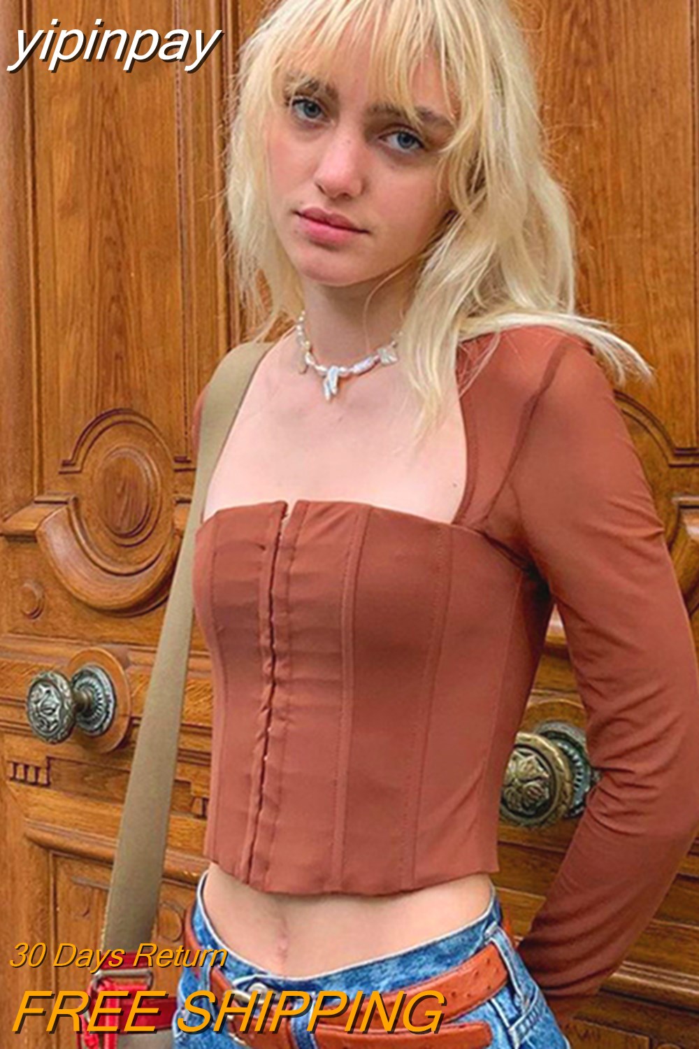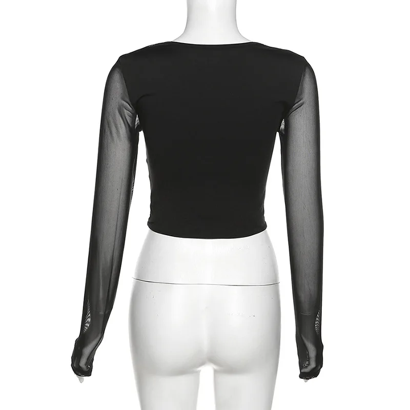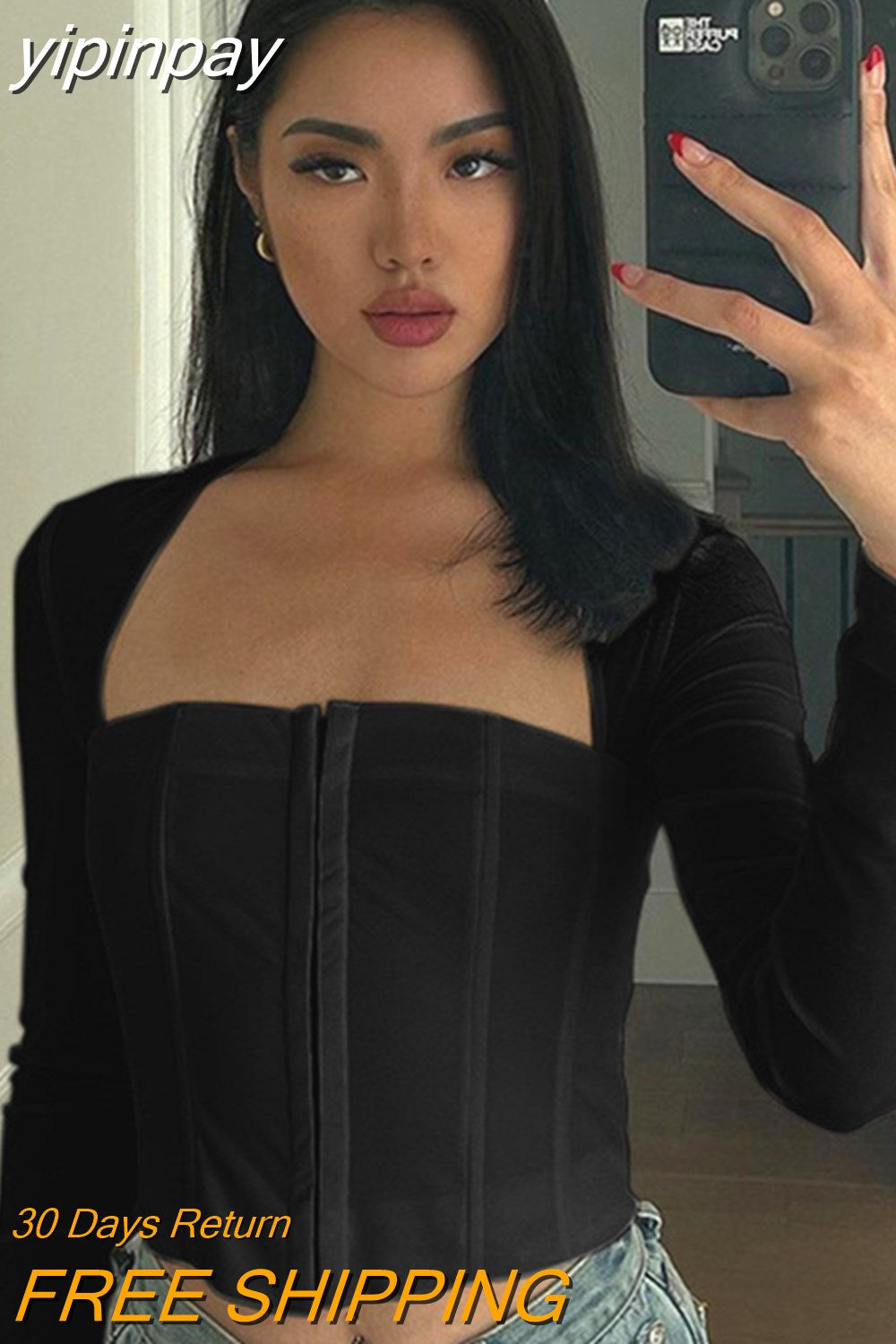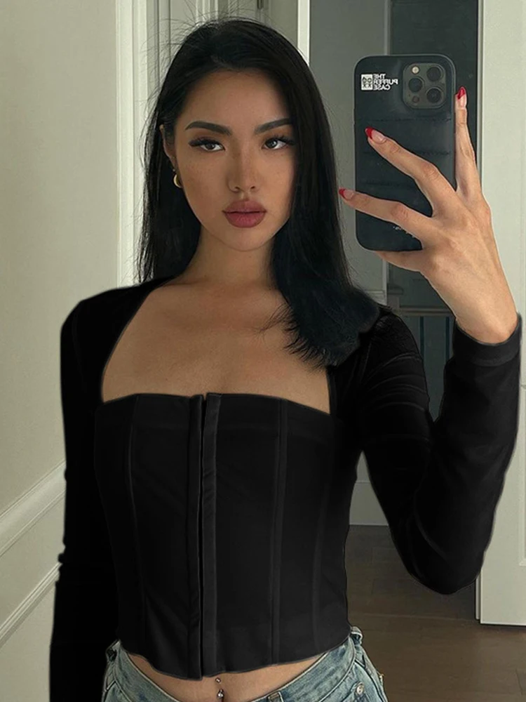 yipinpay T-Shirts Y2K Crop Top Black T Shirt Women Square Neck Sexy Tees Fall Winter Skinny Streetwear Long Sleeve Top