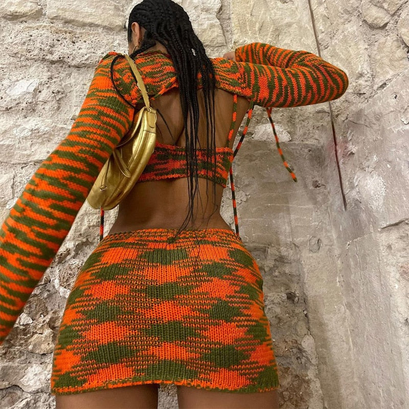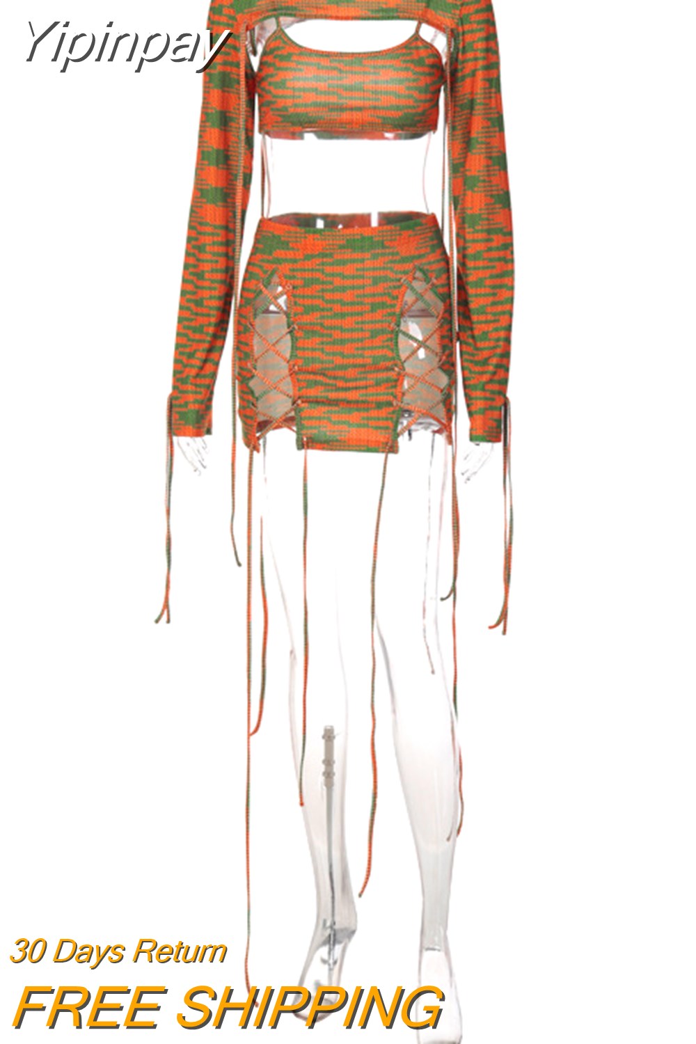 Yipinpay Three-piece Dress Sets Women Matching Sets Streetwear E-girl Long Sleeve Crop Tops+Straps Camis+Cross Bandage Skirts