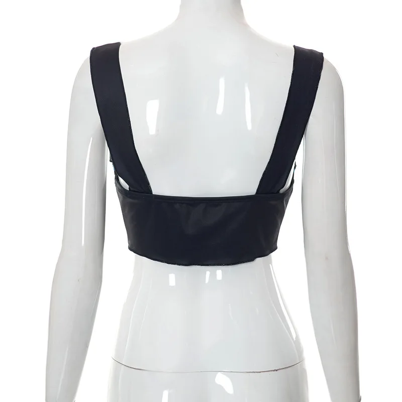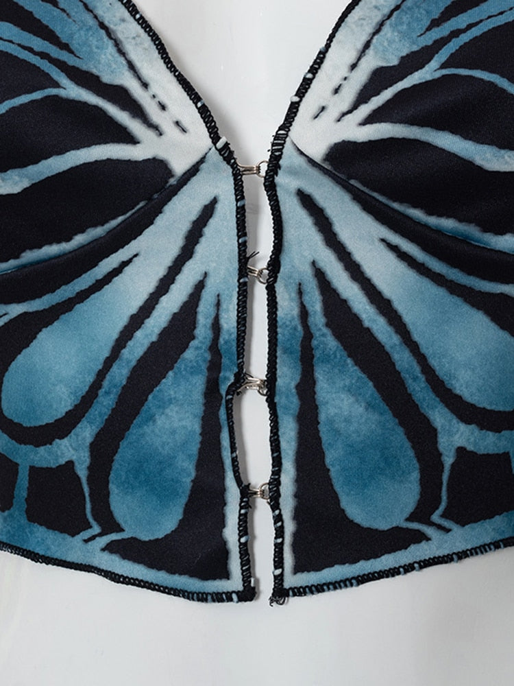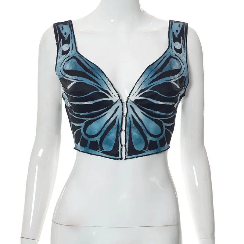 yipinpay Top Women Butterfly Print Crop Top Sweetheart Neck Cami Top Hook Eye Blue Corset Top Streetwear Clothes Slim Backless Tops