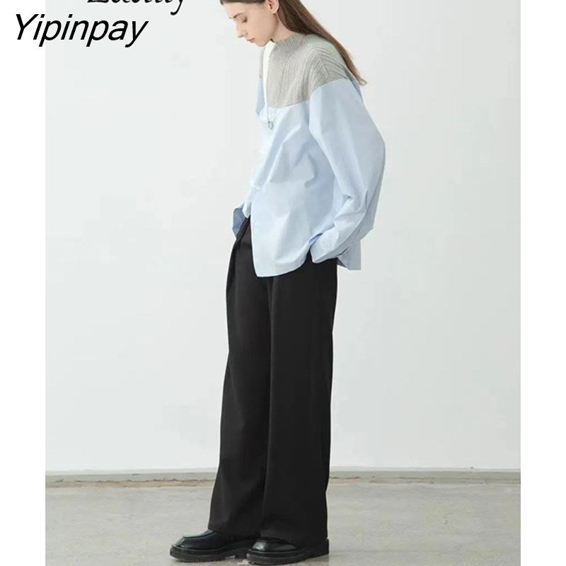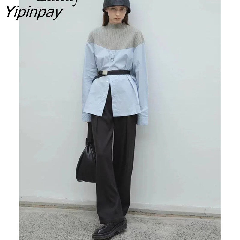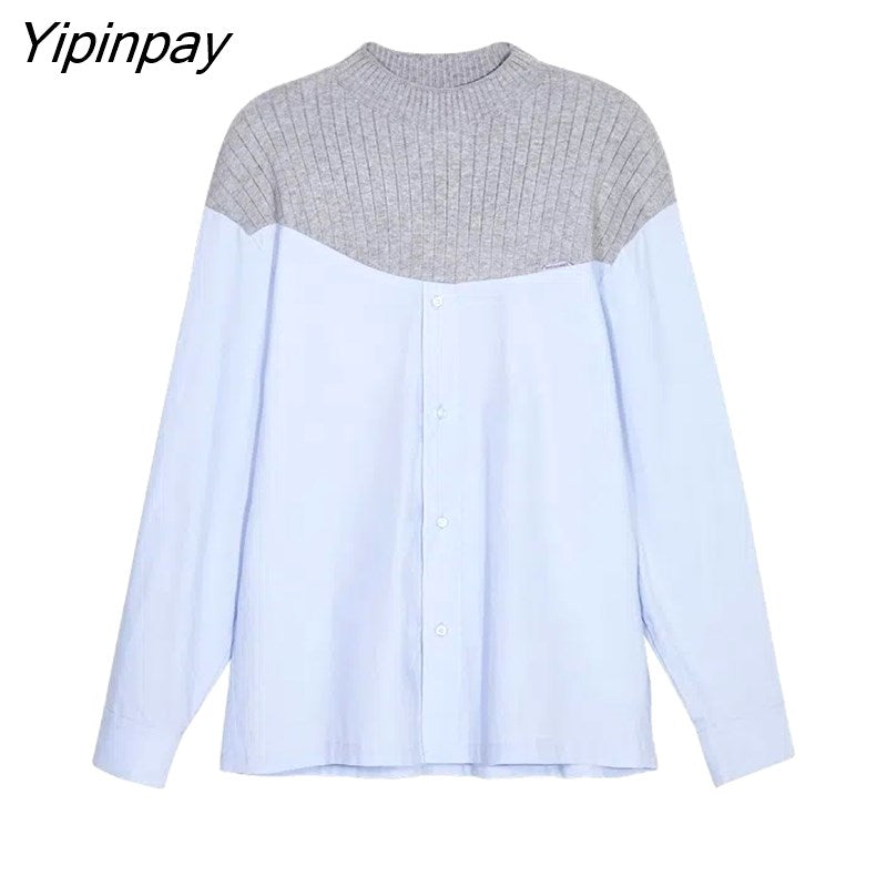 Yipinpay Winter Office Lady Long Sleeve Patchwork Knit Women Shirt Loose O Neck Work Blouse Tops 2023 New In Work Female Clothing