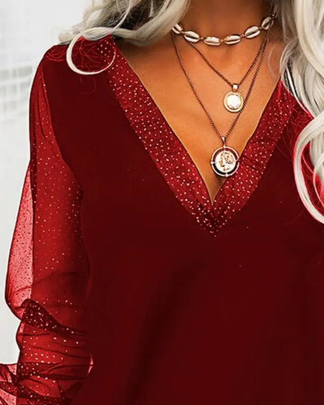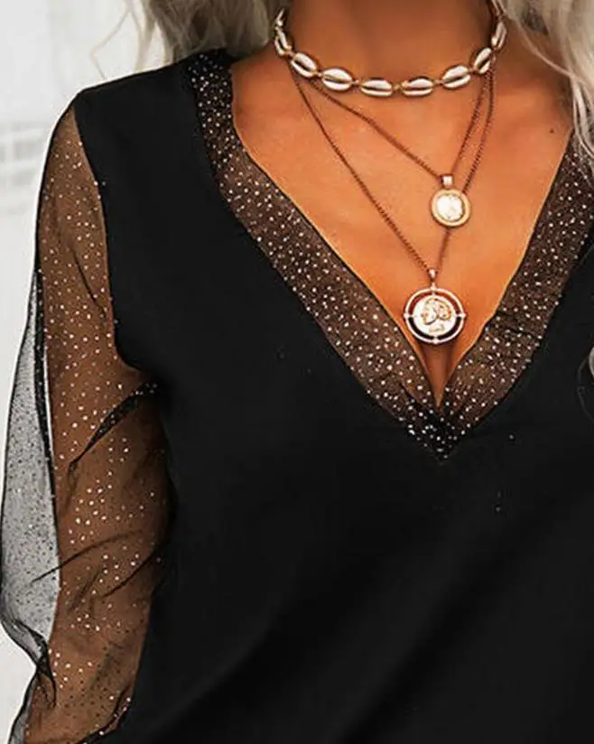 Yipinpay Woman Blouses Shirt Contrast Mesh Long Sleeve Top T-Shirts Pullover Tops Autumn Winter New Fashion Casual