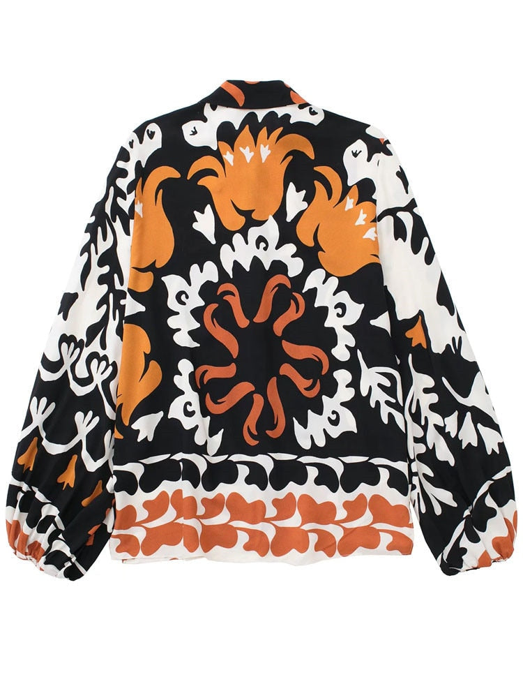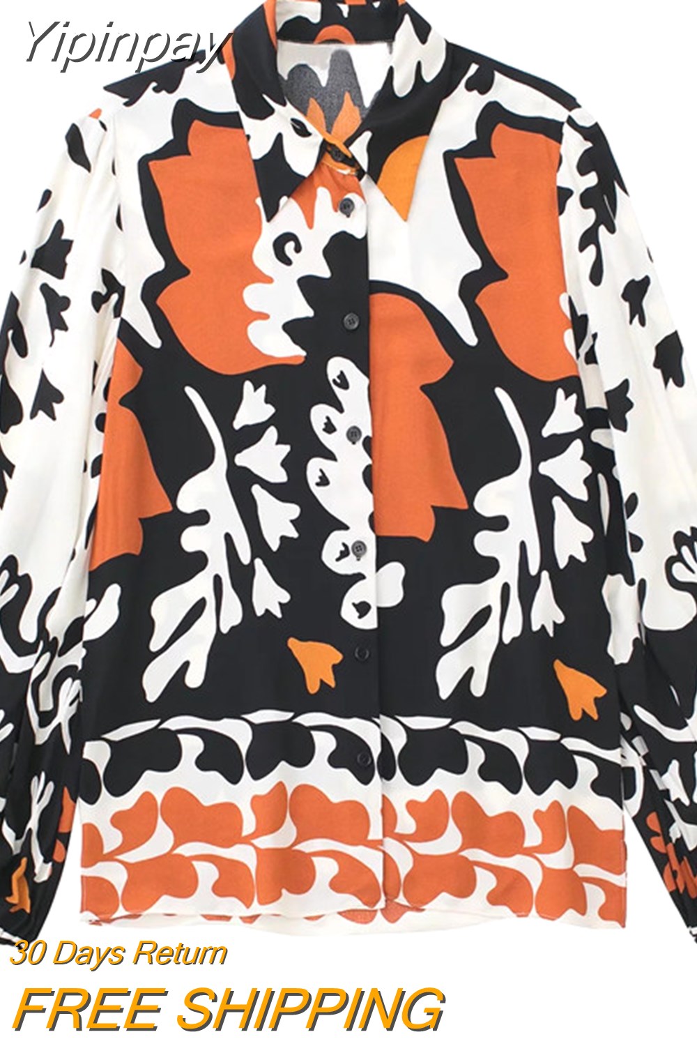 Yipinpay Women Blouse Print Button Up Shirt Woman Puff Long Sleeve Top Female Vintage Baggy Collared Shirt Fashion Streetwear Blouse