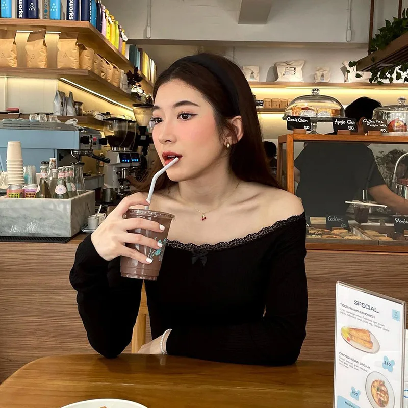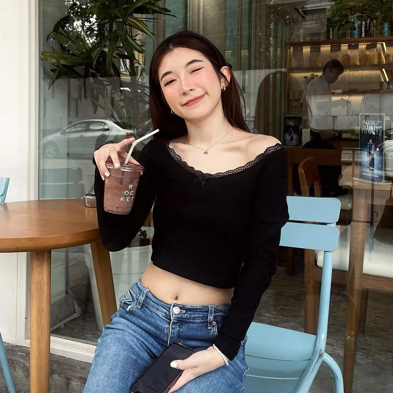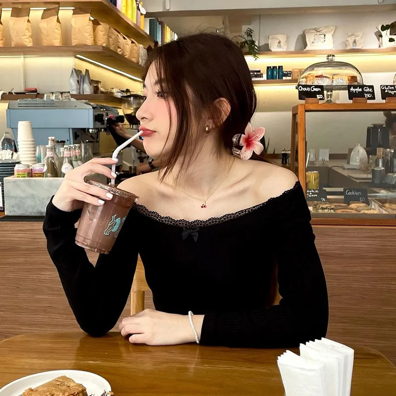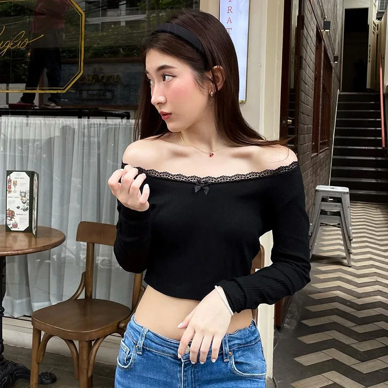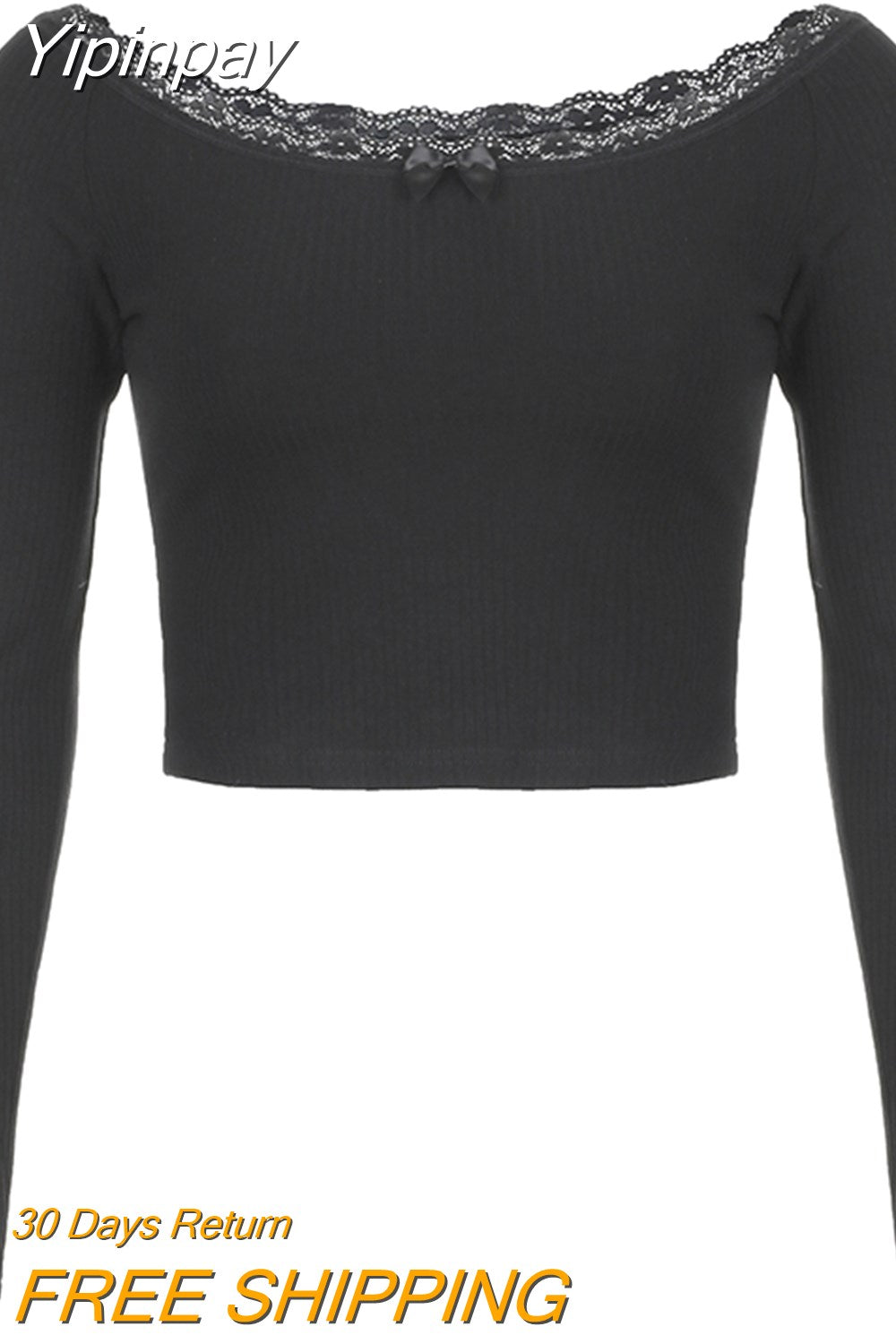 Yipinpay Women Crop Off-Shoulder Tops Lace Patchwork Long Sleeve T-Shirt Casual Pullovers Club Streetwear Aesthetic Clothes