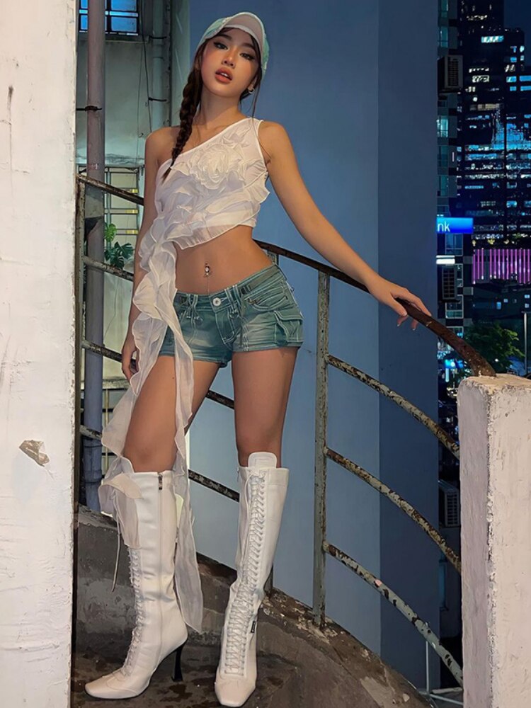 Yipinpay Women Flower Crop Tops Fashion One Shoulder Sleeveless Mesh Ruffle Patchwork Asymmetrical Tassel Tank Summer T-shirt