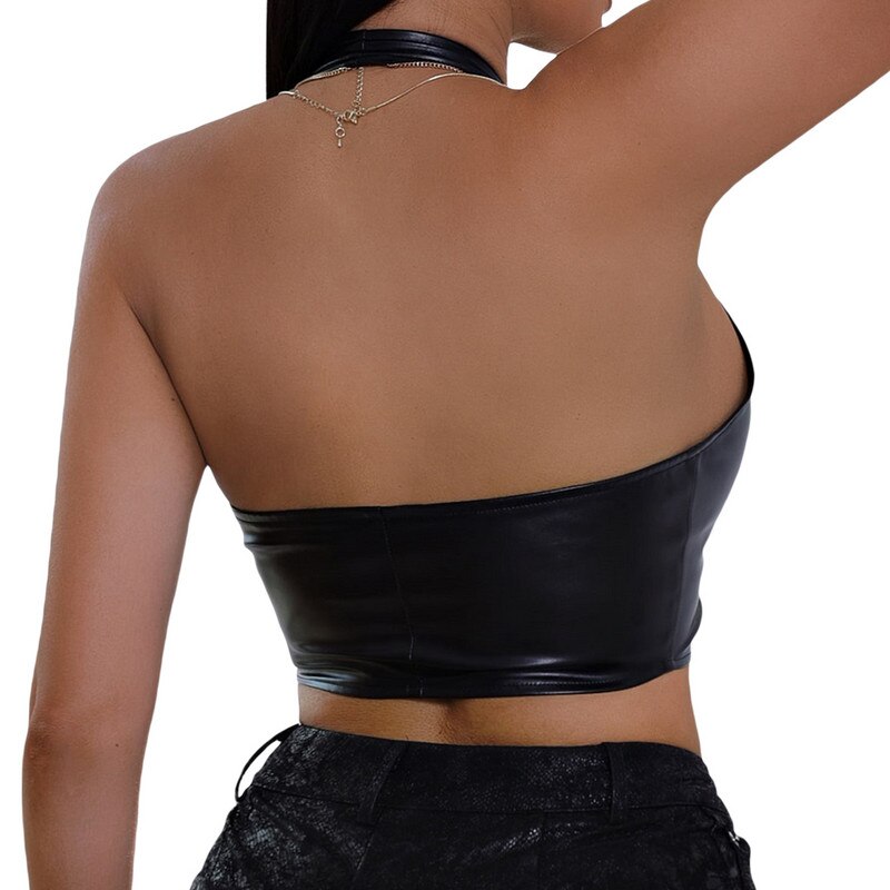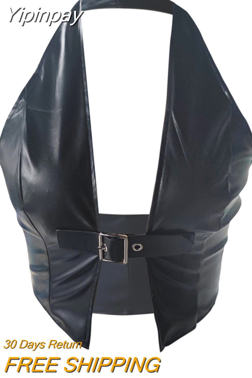 Yipinpay Women Leather Halter Tank Crop Tops Summer Clothes 2023 Sexy Sleeveless Backless Split Buckle Crop Tops Club Streetwear