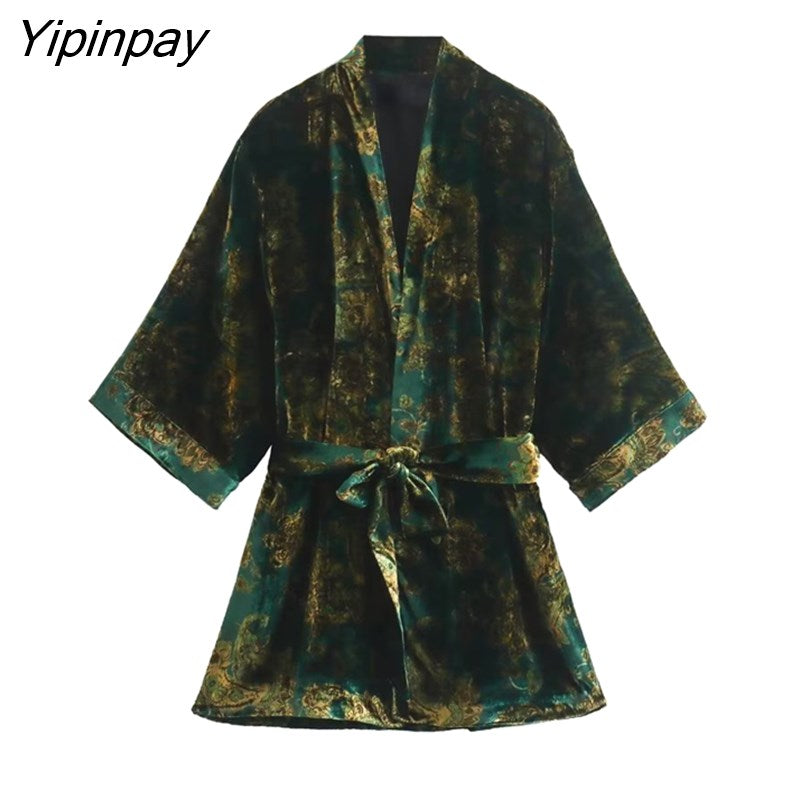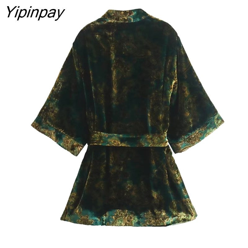 Yipinpay Women Loose Velvet Kimono Blouses WIth Belt 2023 Spring Causal Long Sleeved Tops Printed Fashion V-neck T-Shirts