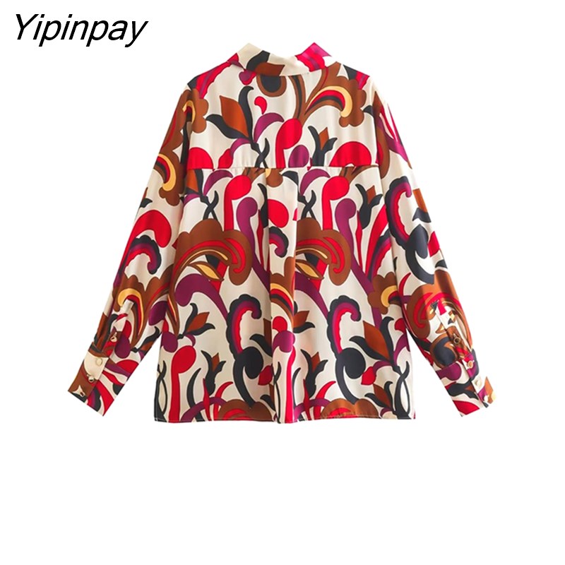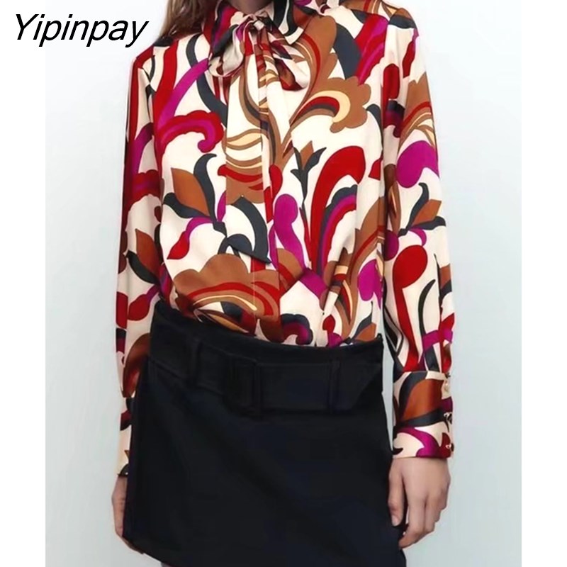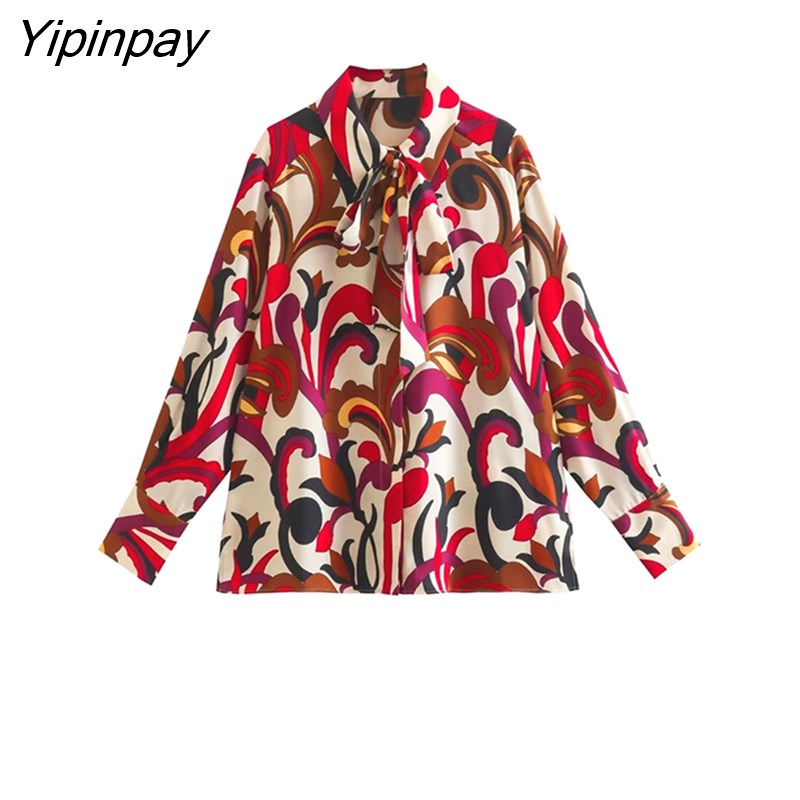 Yipinpay Women Printed Shirt Blouses 2023 Spring Summer Bow Turn Down Collar Long Sleeved Tops Vintage Single Breasted T-Shirts