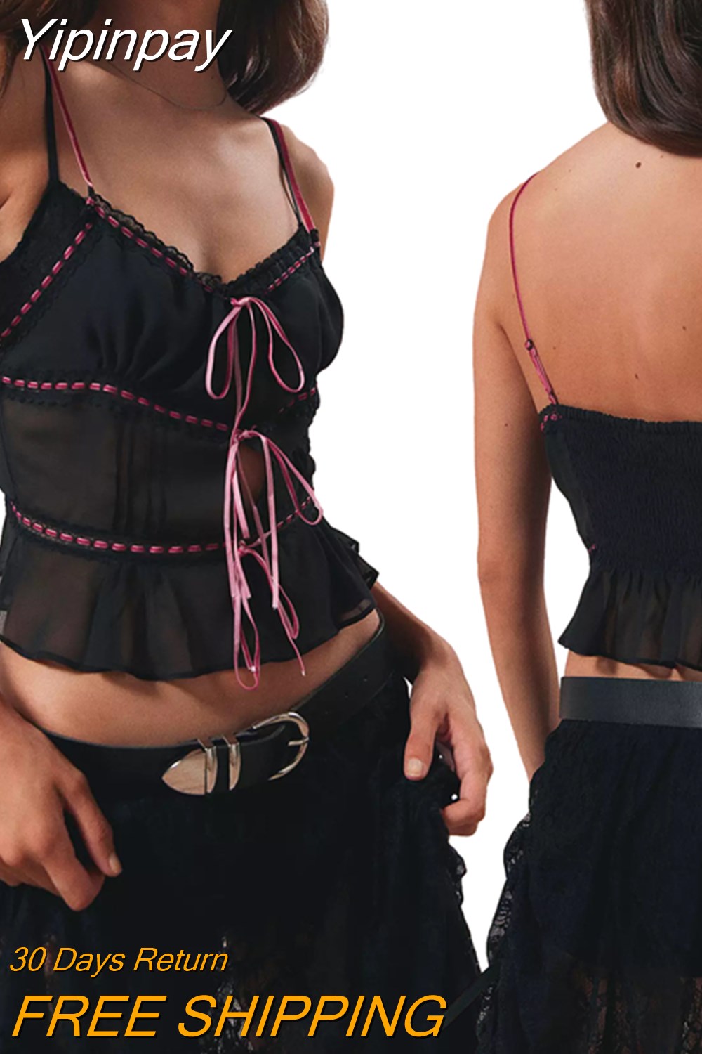 Yipinpay Women’s Y2K Vintage Summer Sheer Mesh Cami Tops Lace Trim Adjustable Strap See Through V Neck Elastic Back Crop Tops