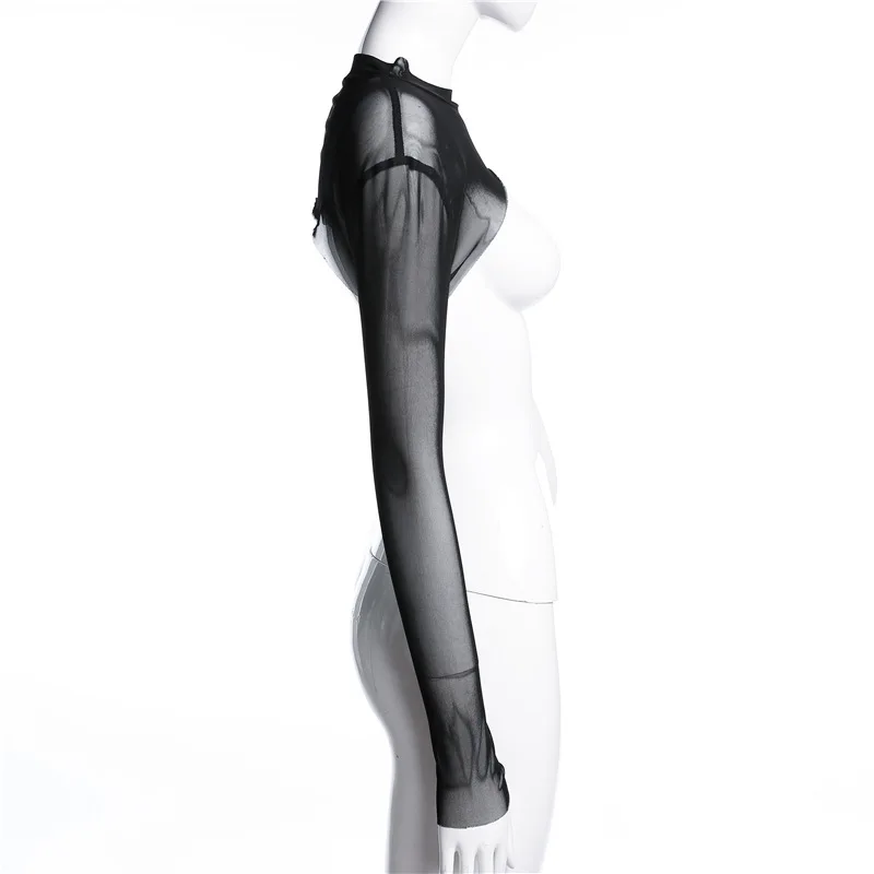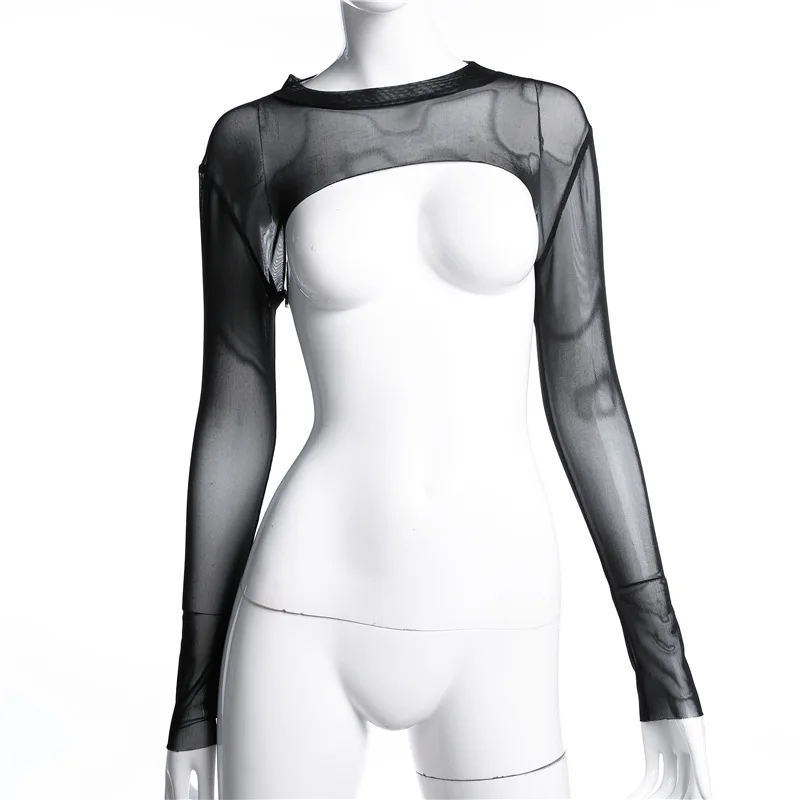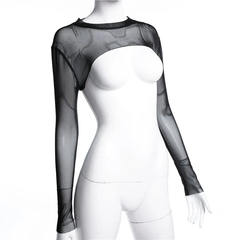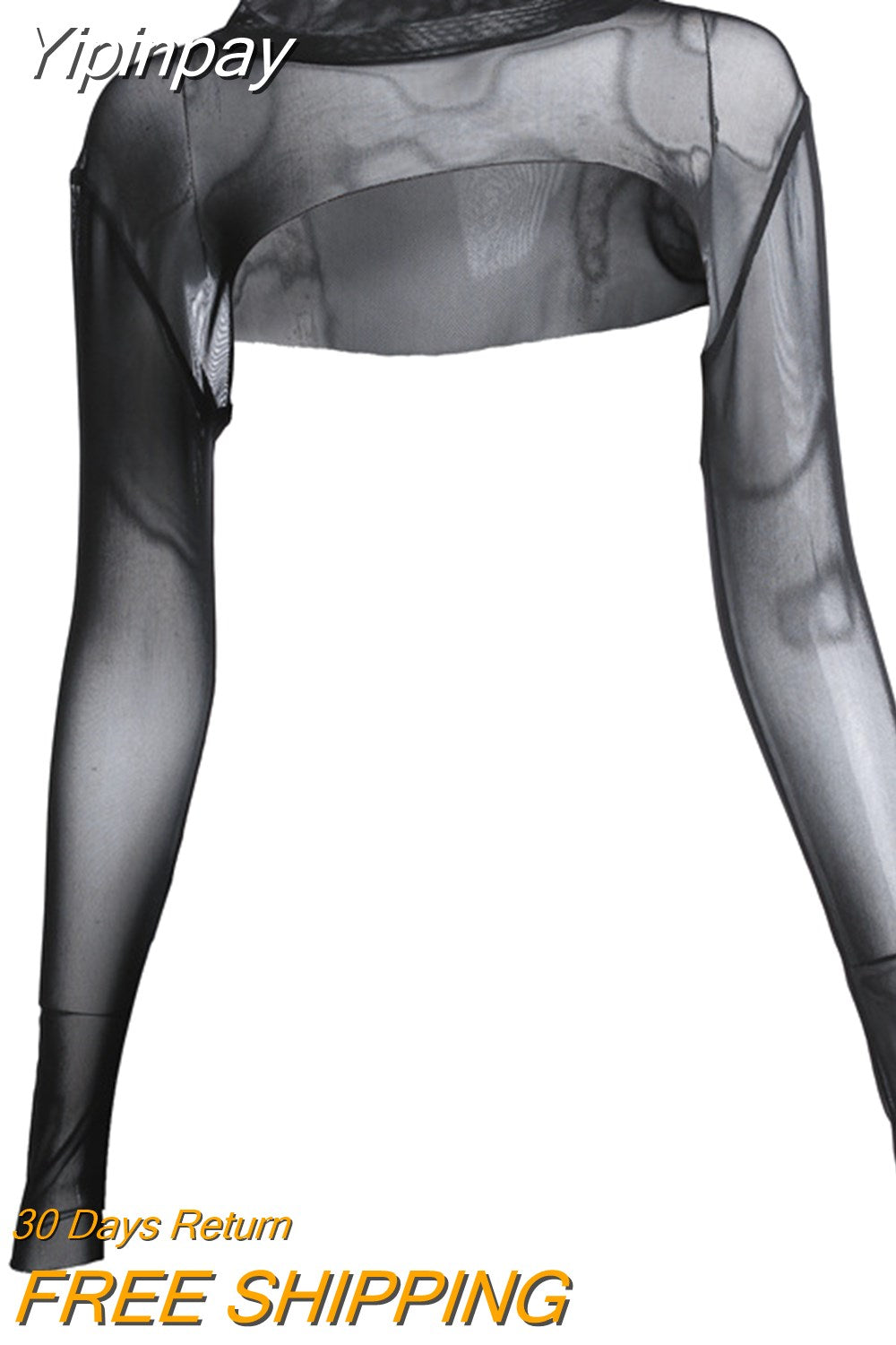Yipinpay Women Sexy Sheer Crop Top Mesh T Shirt New Long Sleeve Cover Up T-Shirt V Neck Sleeveless Tie Up Camisole With Cross Chain Strap