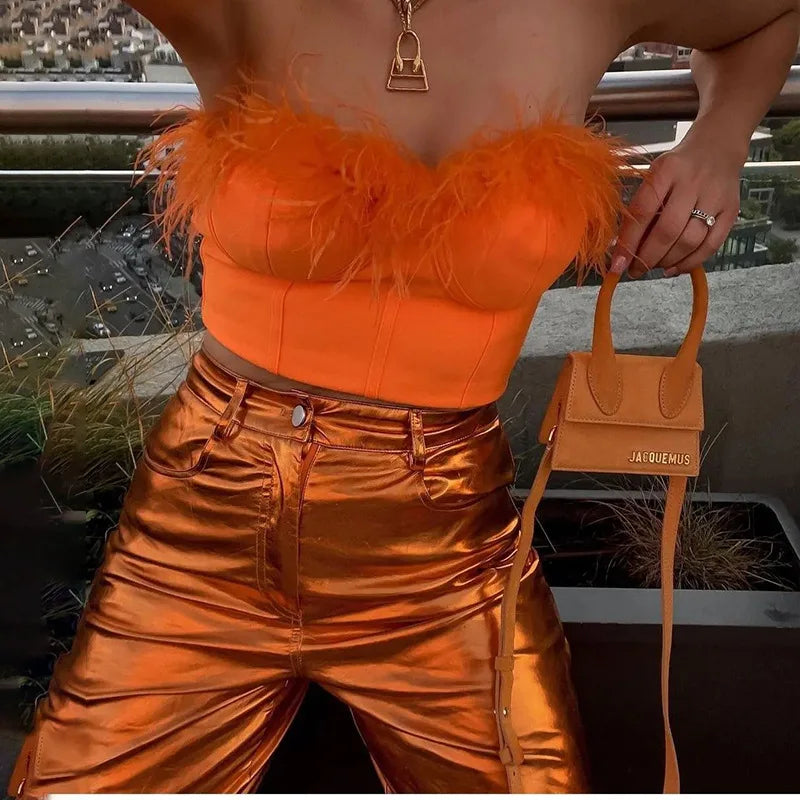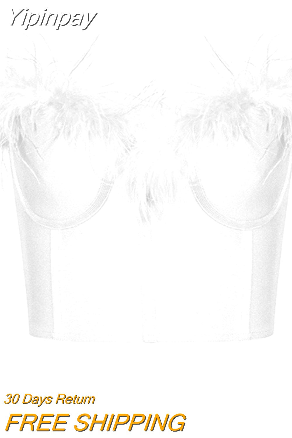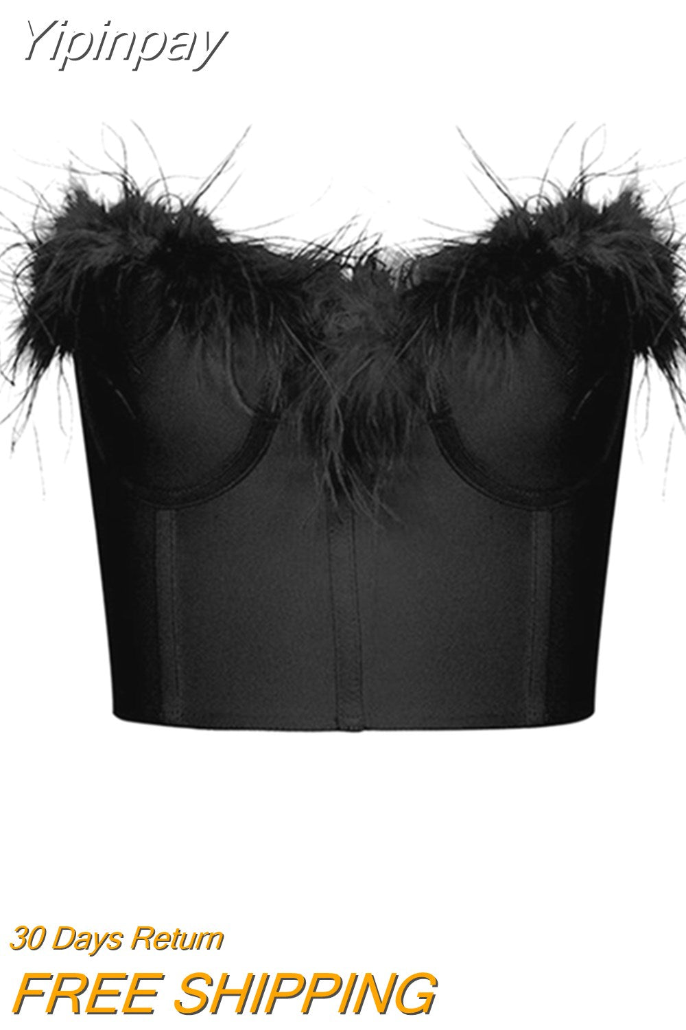 Yipinpay Women Tube Tops Solid Color Feather Furry Trim Sleeveless Off Shoulder Backless Back Zipper Slim Fit Crop Tops