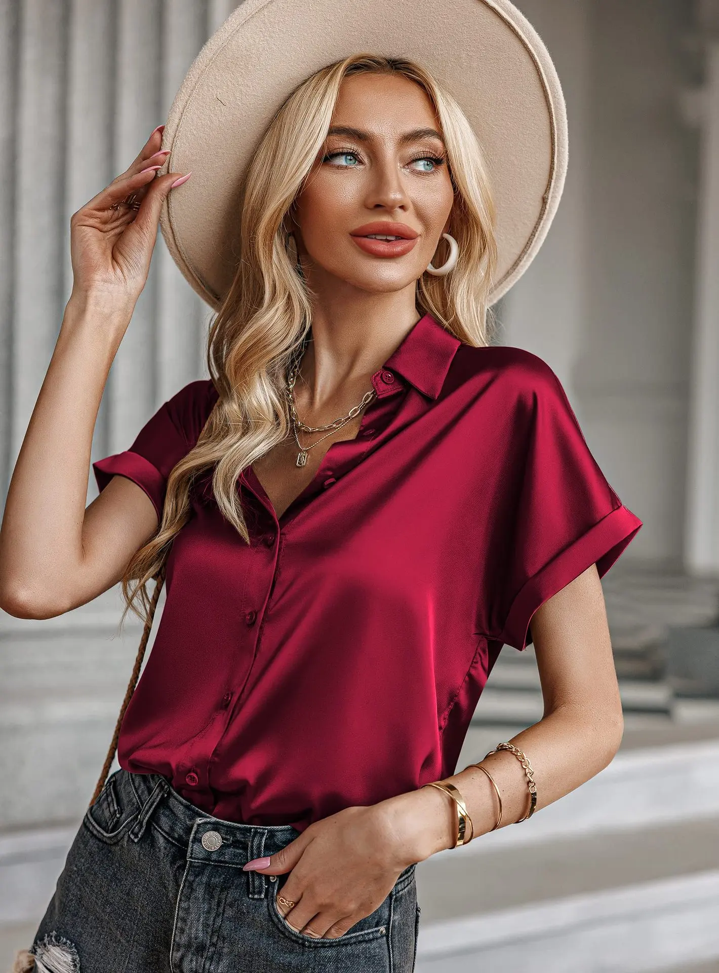 Yipinpay Women's Blouses Elegant Satin Silk Shirts Short Sleeve Tops Fashion Buttons Office Lady Blouses Loose Women's Clothing