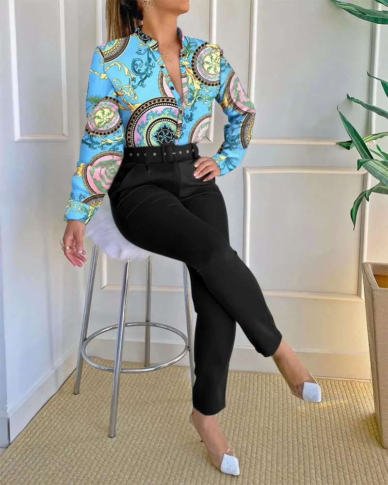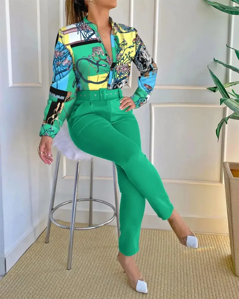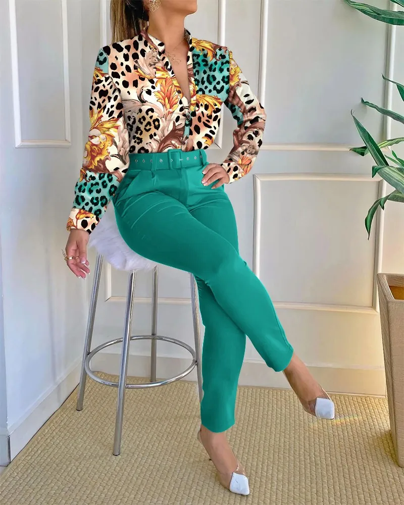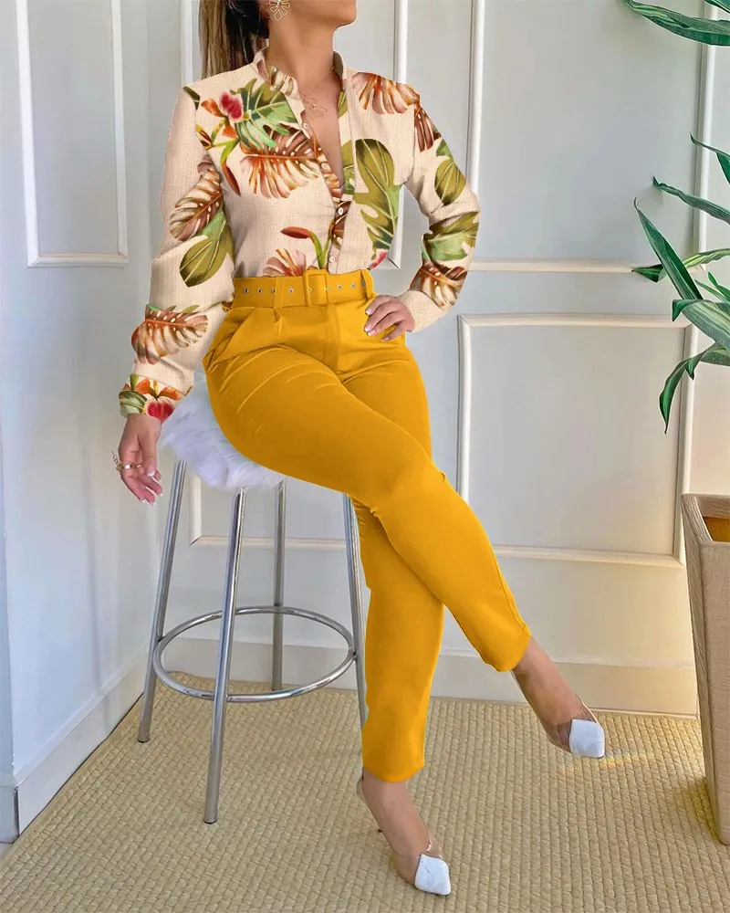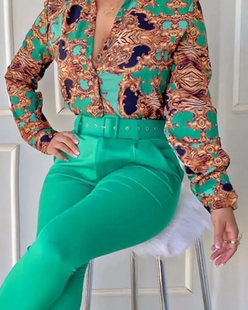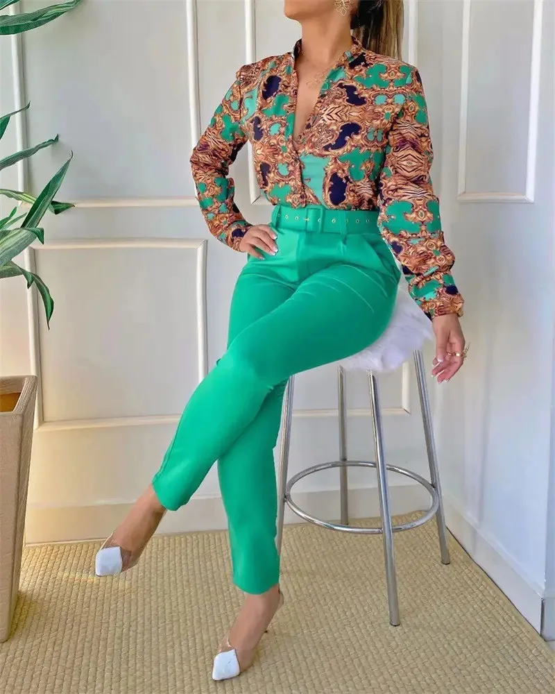 Yipinpay Women's Shirt 2 Pieces Suit Sets 2024 Fall Print Shirt Belt Pants V-Neck Long Sleeve Top 2 Pieces Suit Sets Casual Work Female