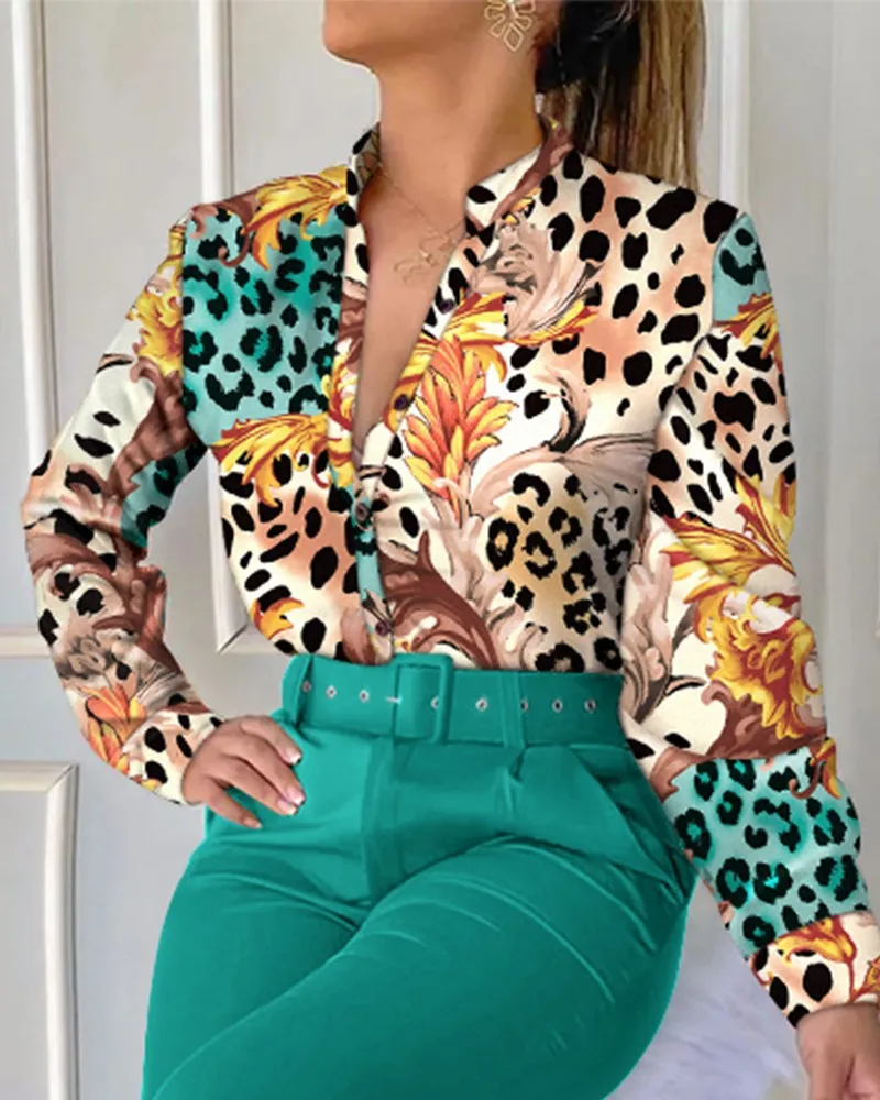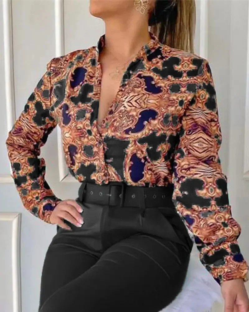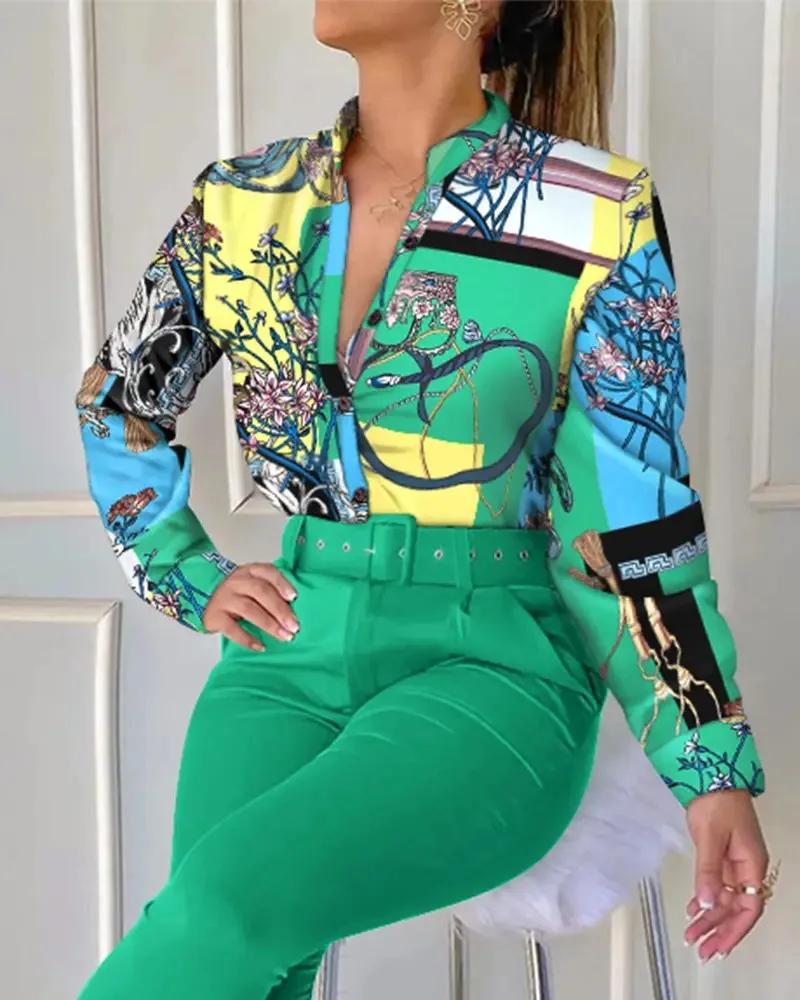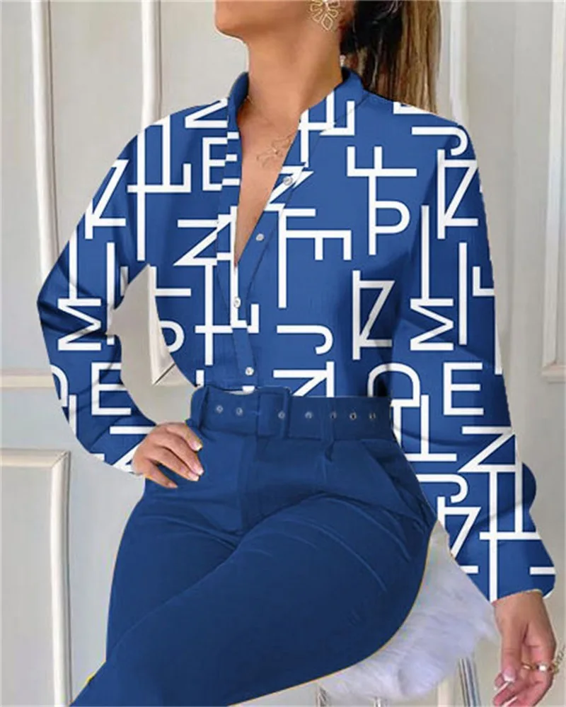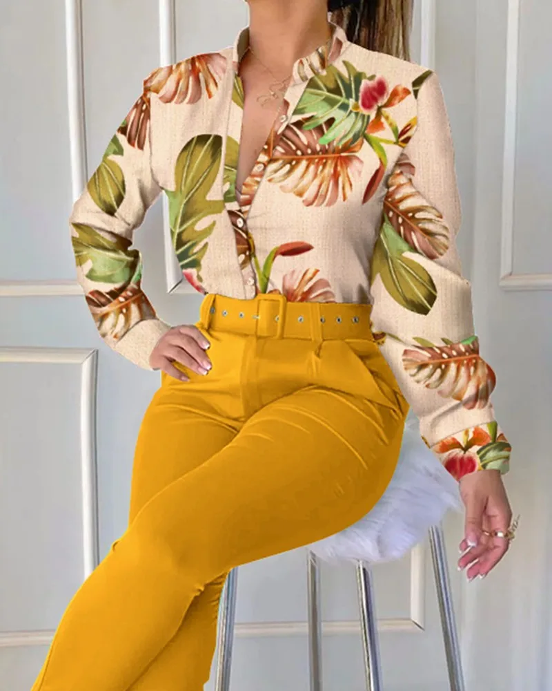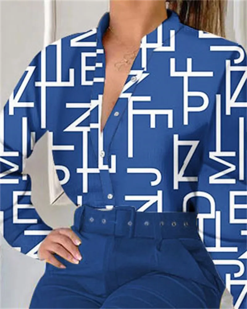 Yipinpay Women's Shirt 2 Pieces Suit Sets 2024 Fall Print Shirt Belt Pants V-Neck Long Sleeve Top 2 Pieces Suit Sets Casual Work Female