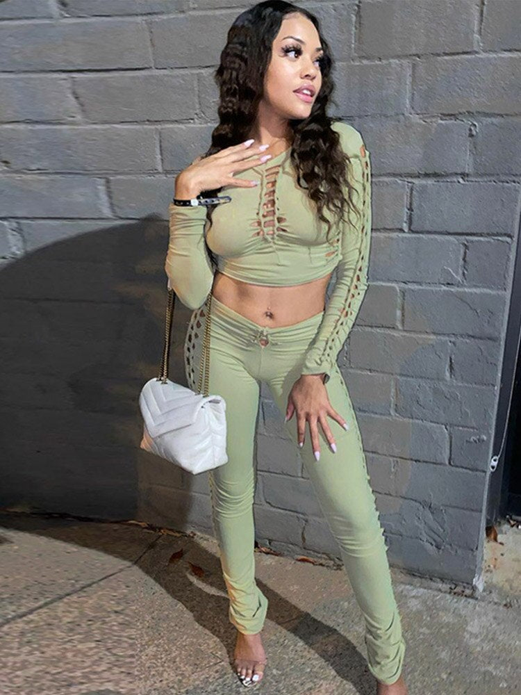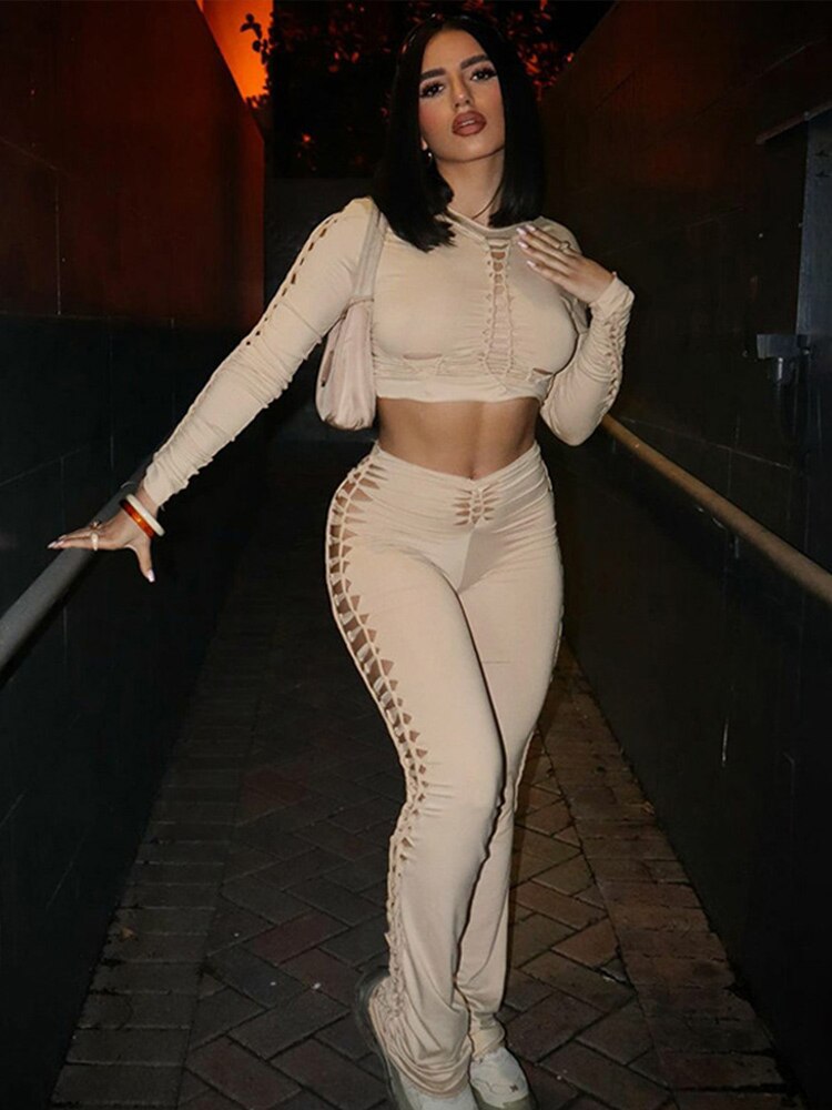 Yipinpay Womens Slim Hollow Out Tracksuit Fashion Long Sleeve Cropped Top Pencil Pants Matching Suit 2023 Trend High Street Clubwear