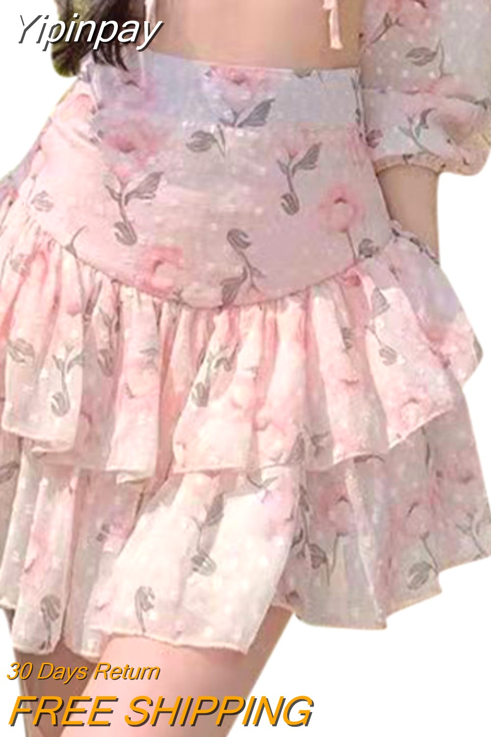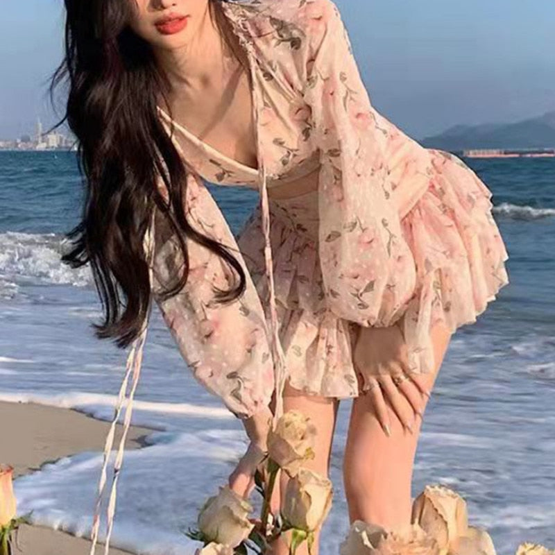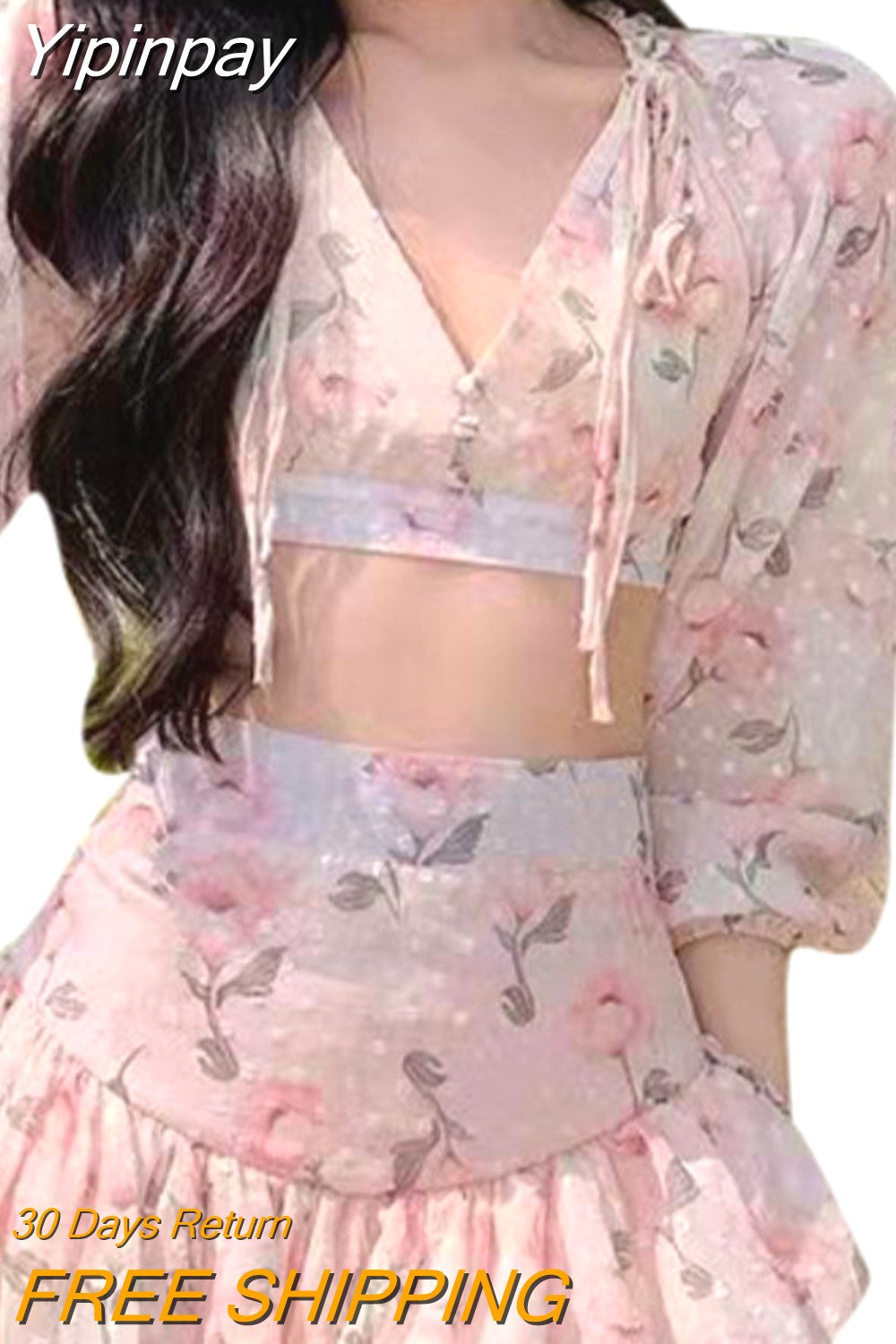 Yipinpay Women's Suit 2Pcs Summer Outfits Skirt Sets Long Sleeve Deep V Neck Floral Crop Tops + Mini Skirt Set Women's Clothes Fall 2023
