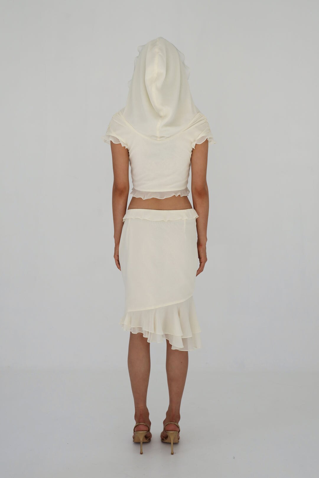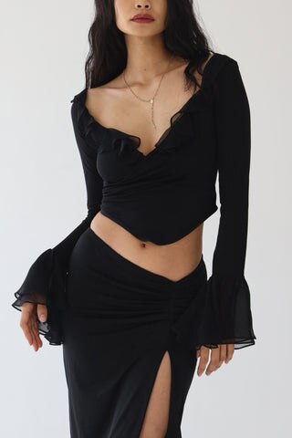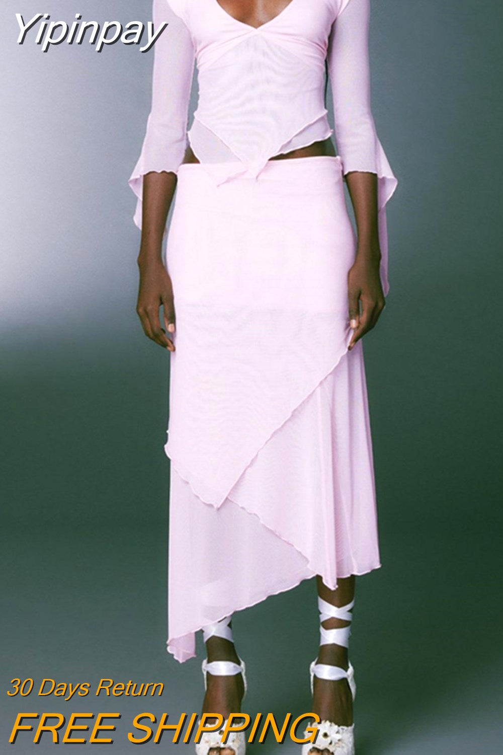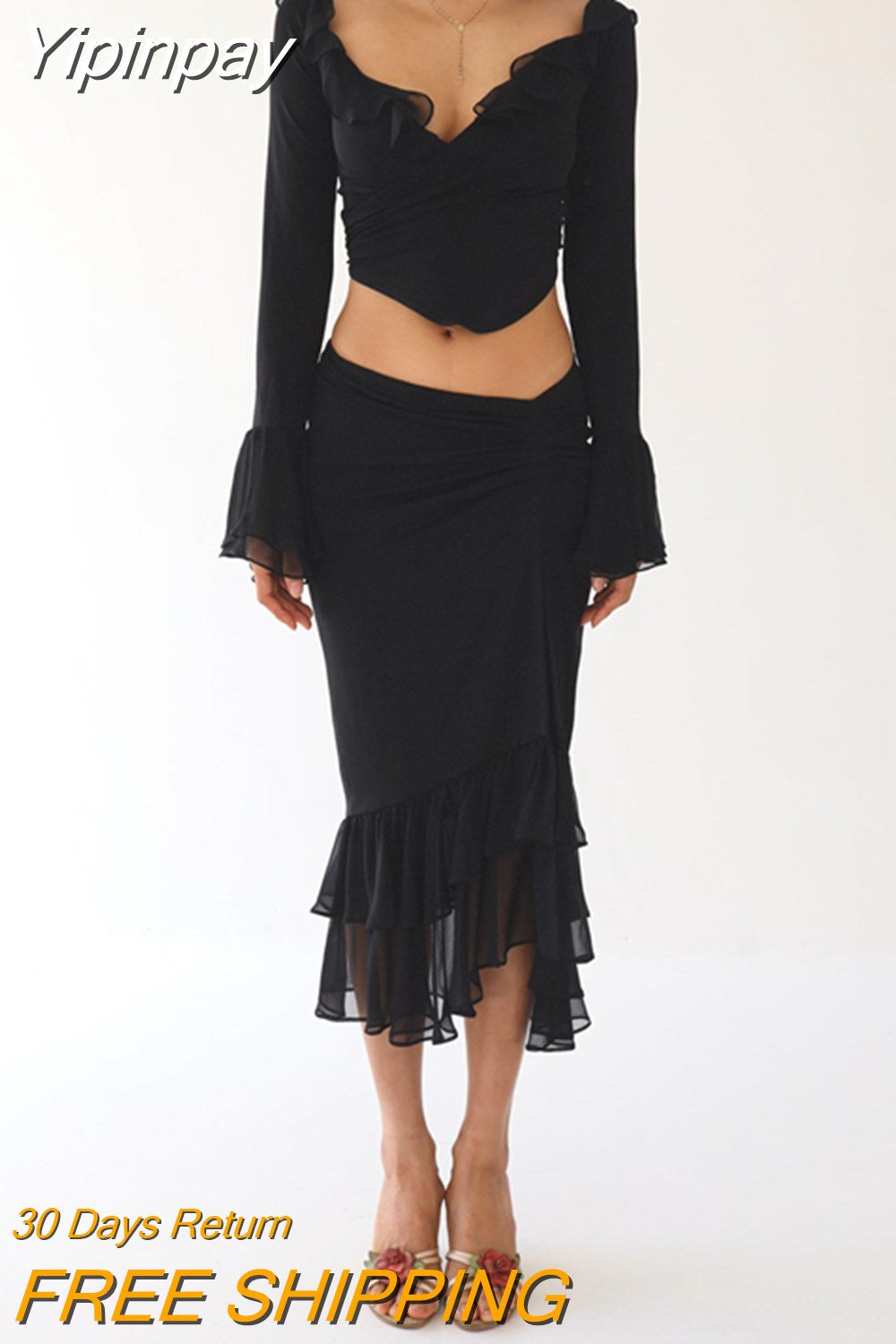 Yipinpay Womens Summer Skirt 2Pcs Suit Solid Color Long Sleeved Ruffled V-Neck Cropped Tops + Low Waist Fish Tail Slit Long Skirt 920
