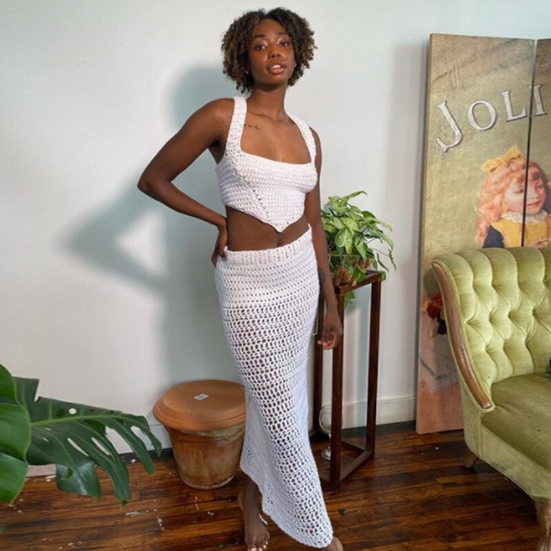 Yipinpay Womens Two-Piece Outfits Sleeveless Square Neck Backless Irregular Hem Short Tops + Low Waist Long Skirt Beachwear Hot