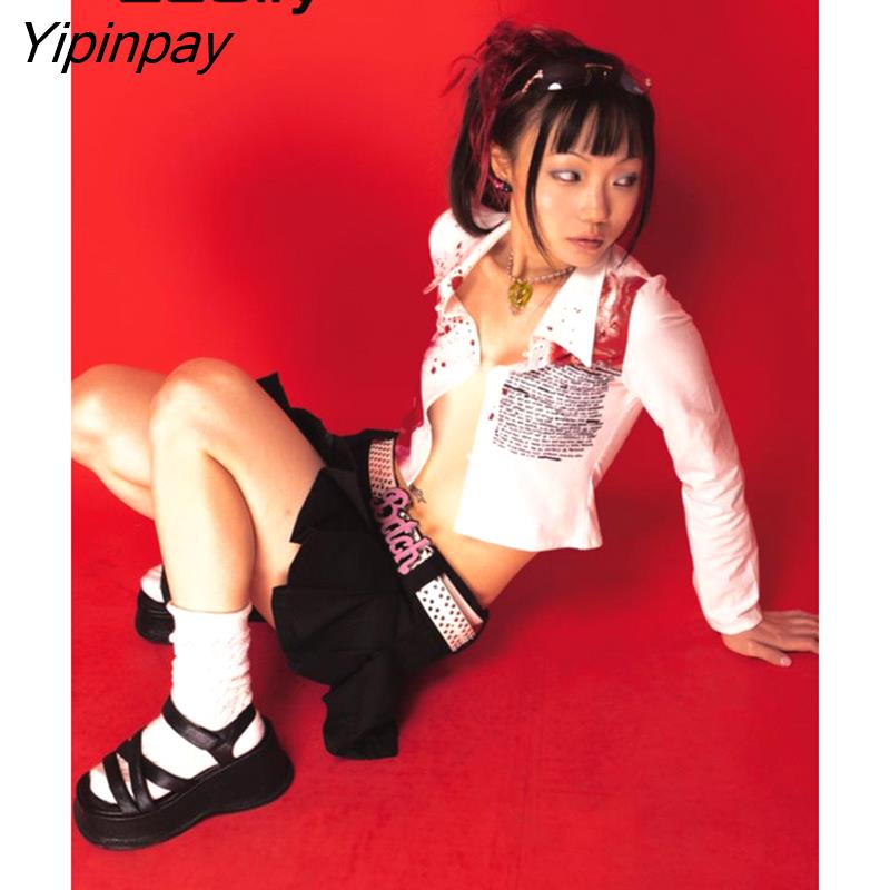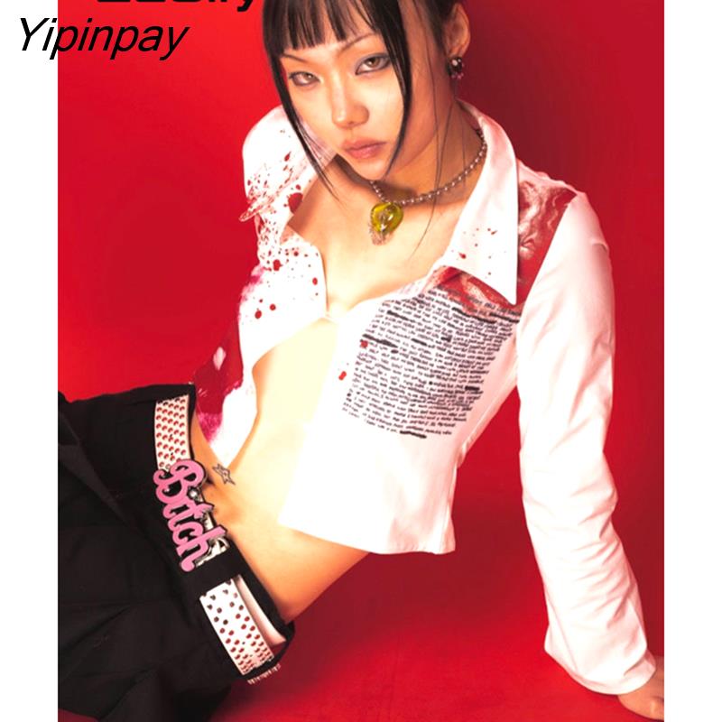 Yipinpay Y2K Bloodstain Print Long Sleeve Shirt Women Sexy Slim Button Female emo Crop Top Shirts 2023 Summer Club Blouse Tops