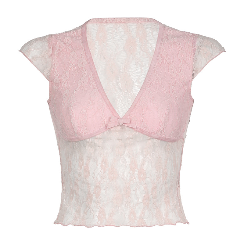 Fresh Girl Feeling Lace Bow Stitching Small Sexy V-Collar Perspective Color Slim Flying Sleeve T-Shirt 2024