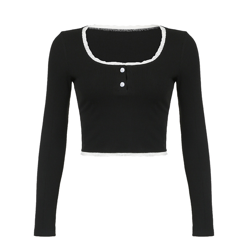 Ins Sweet And Spicy Lace Hit The Color Pit Strip Long-Sleeved Spicy Girls Short Navel Blouse Slim And Slim T-Shirt