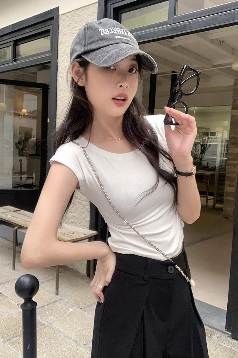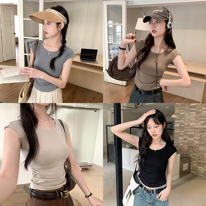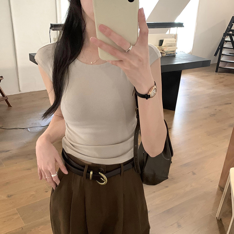 Korean Style Simple Shoulder Short-Sleeved T-Shirt Women's Summer Thin Style Design Feeling Solid Color Full-Fitting Spicy Girls Short-Style Blouse