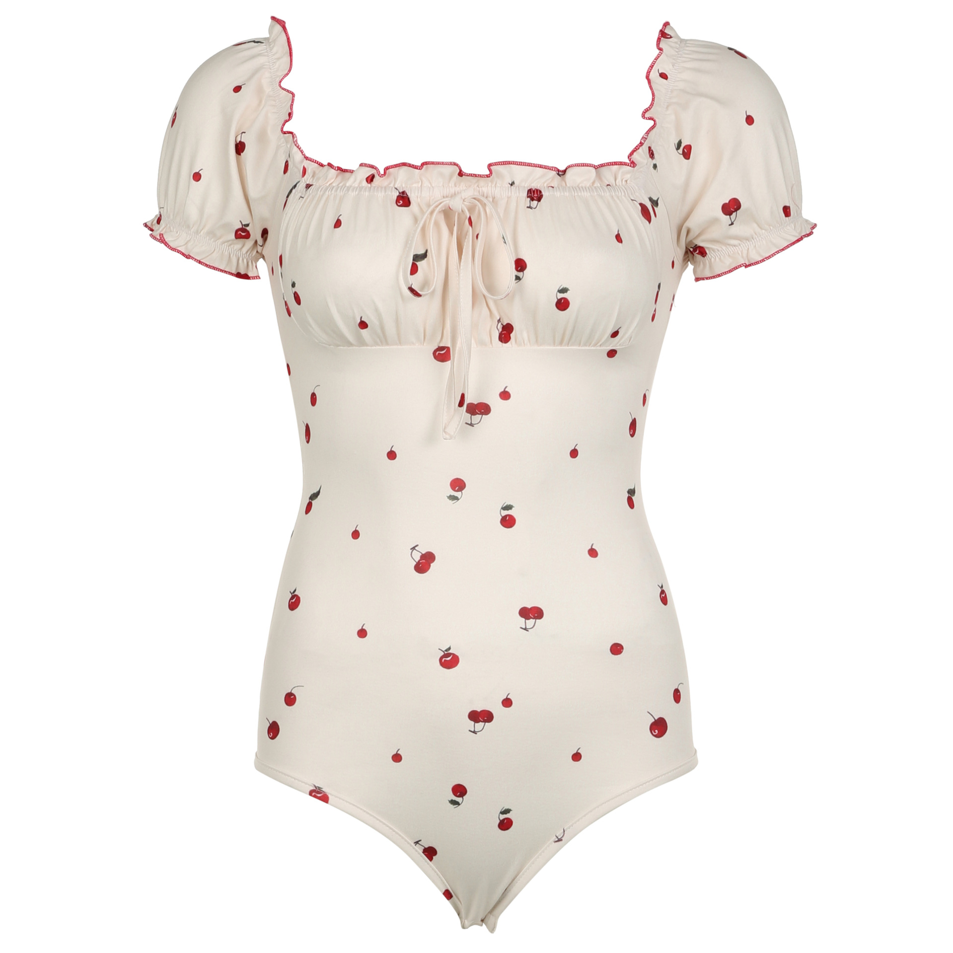 Pure Desire Atmosphere Feeling Cherry Printed Wood Ear Splicing Swimming Suit Square Collar Back Dewy Back Design Sexual Bubble Sleeve Jumpsuit