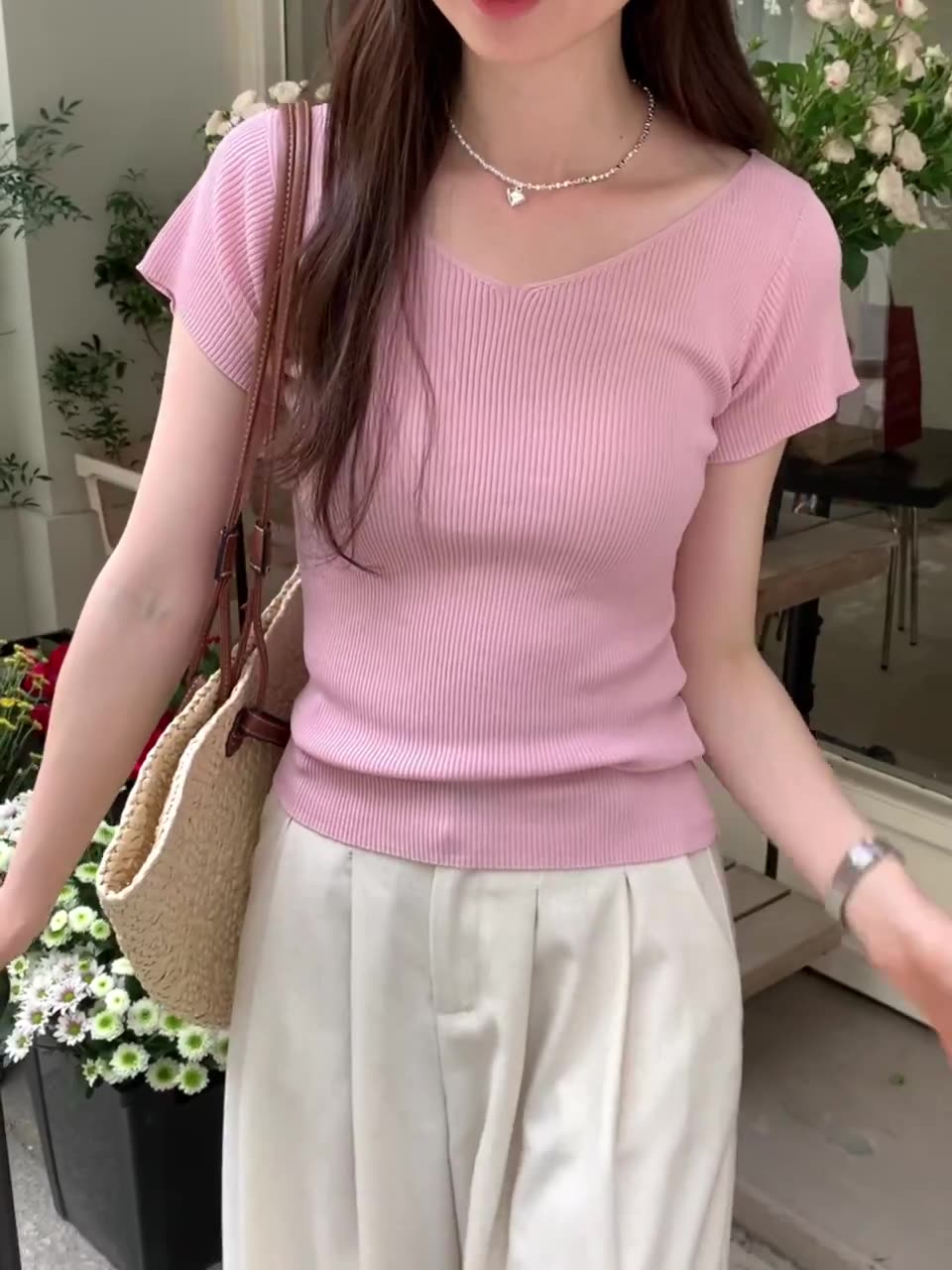 Pure Pink V-Collar Ice Silk Knitted Short-Sleeved T-Shirt Women's New Summer Design Thin Slim Bottomed Blouse