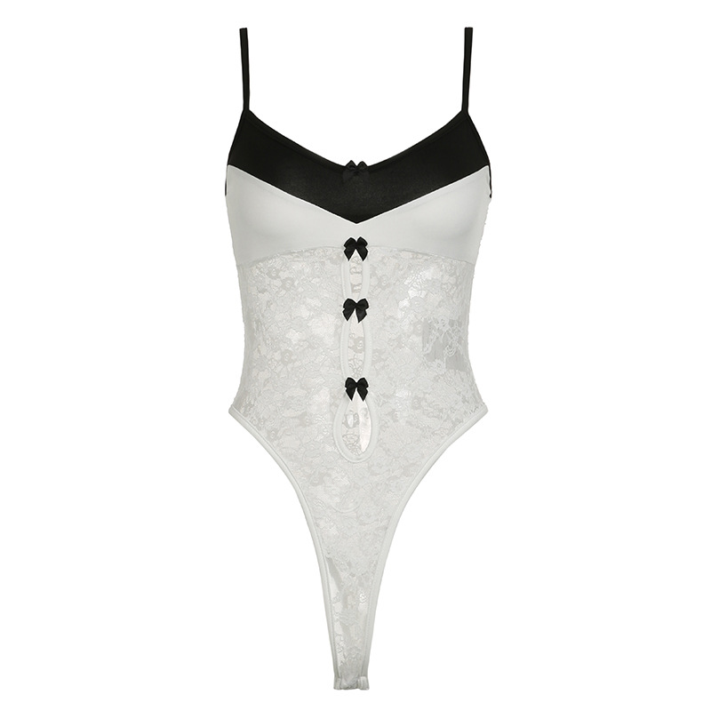 Pure Sexual Lace Splicing, Collision Color Bow, Hollowed-Out Suspenders, Spicy Girls' Waist And Thin Perspective Blouse.