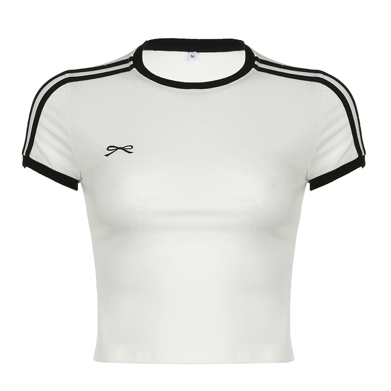 Simple Basic Color Stripes Stitching Embroidery Small Bows Slim Round Neck Short-Sleeved T-Shirts New Fashion
