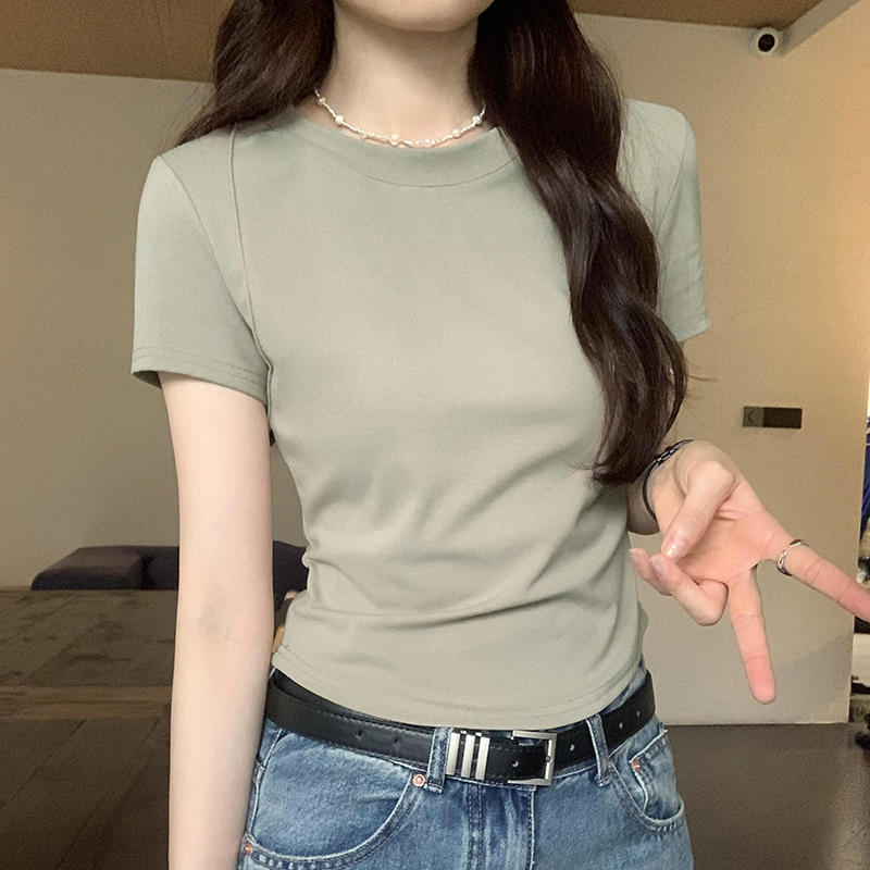 Solid Color Shoulder Short-Sleeved T-Shirt Women's Summer 2024 New Slim And Thin Fishbone Line Base Short Blouse