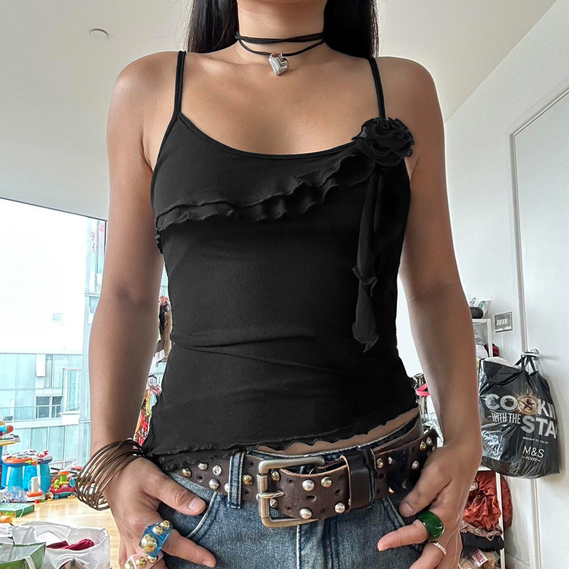 Spicy Girl Style Three-Dimensional Flowers Lotus Leaf Edge Stitching Irregular Net Gauze Solid Color Sling Vest 2024 Summer New Style