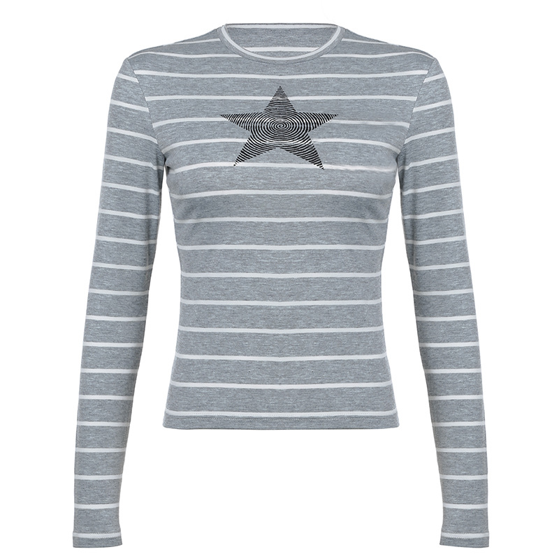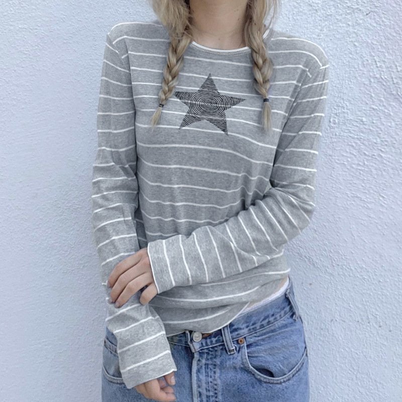 Street Striped Five-Pointed Star Leisure T-Shirt Women's Autumn Daily Simple Commuter Star Hit Color Long-Sleeved Blouse