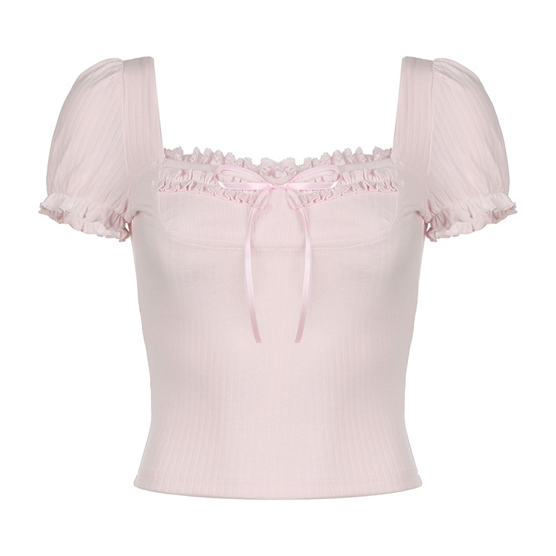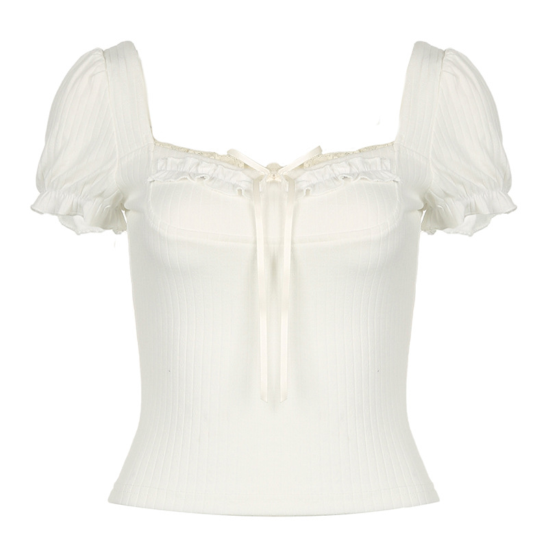 Summer Fresh Romantic Pure Color Square Collar Bubble Sleeve Girl T-Shirt Ins Trend Slim Casual Blouse New Style