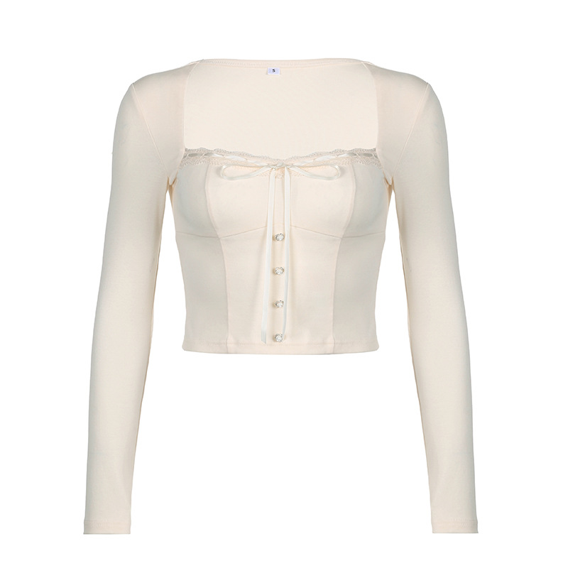 Sweet And Spicy Girl Neckline Lace-Up Long-Sleeved Blouse Women 2025 Pure Style Stylish Design Short Shoulder-Bottomed T-Shirt