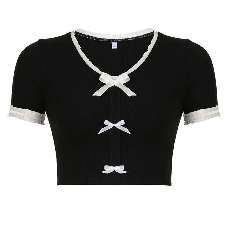 Sweet Girl Lace Lace Bow Stitching Small V-Collar Slim Short Navel T-Shirt 2024 New Style In Early Spring
