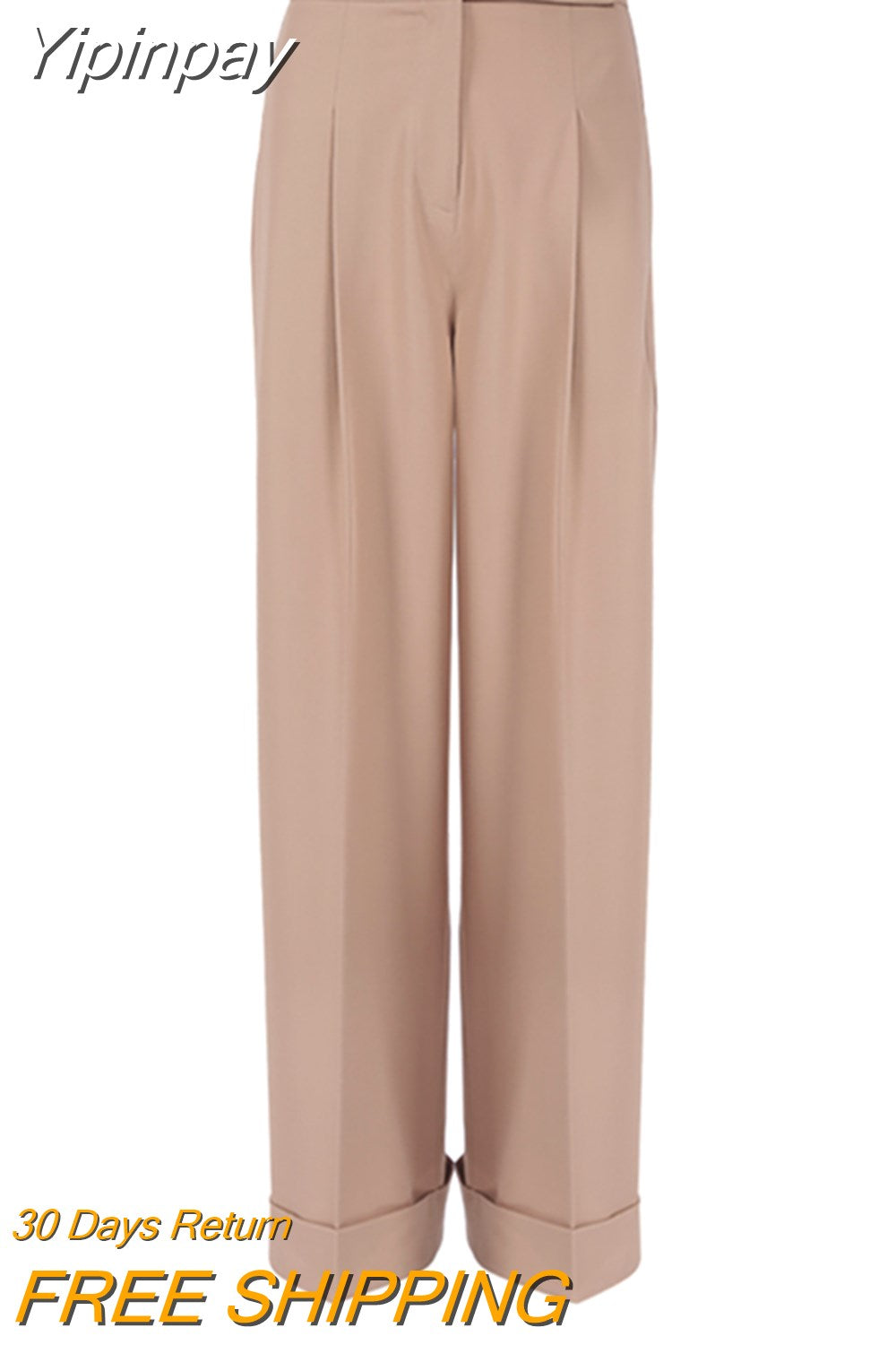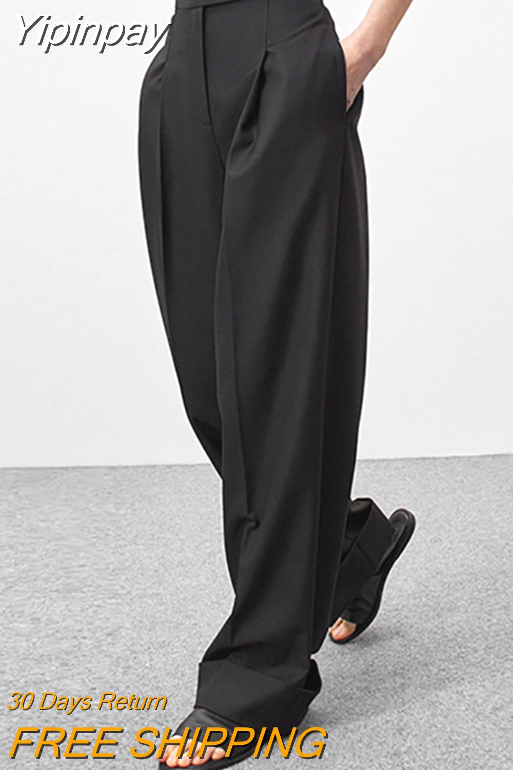 Yipinpay 18 Spring Summer Black Ladies Office Trousers Women High Waist Pants Pockets Female Pleated Wide Leg Pants Solid 2023