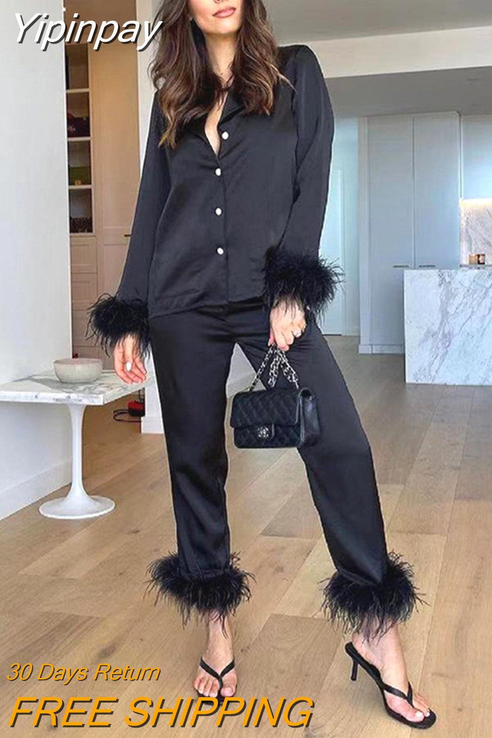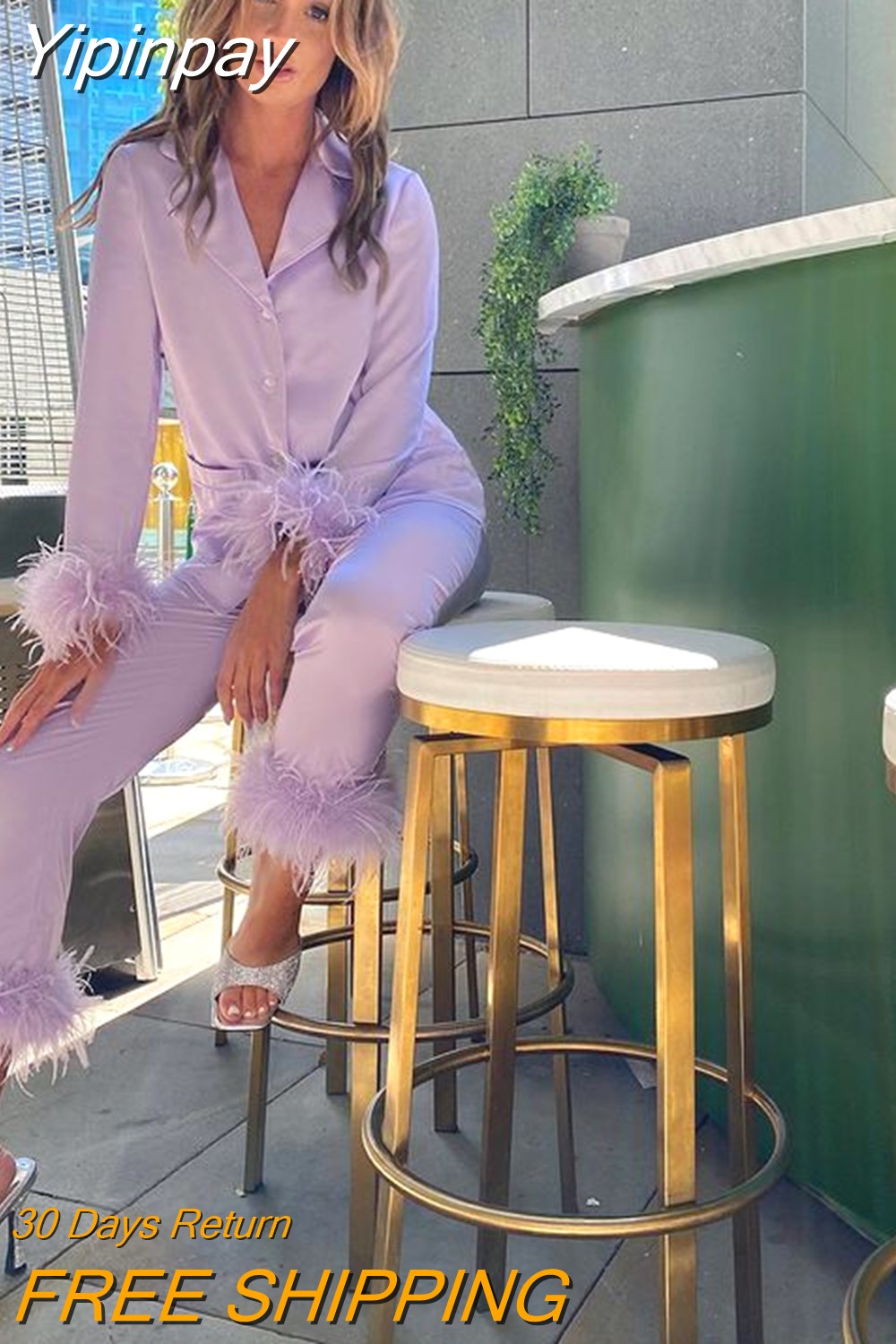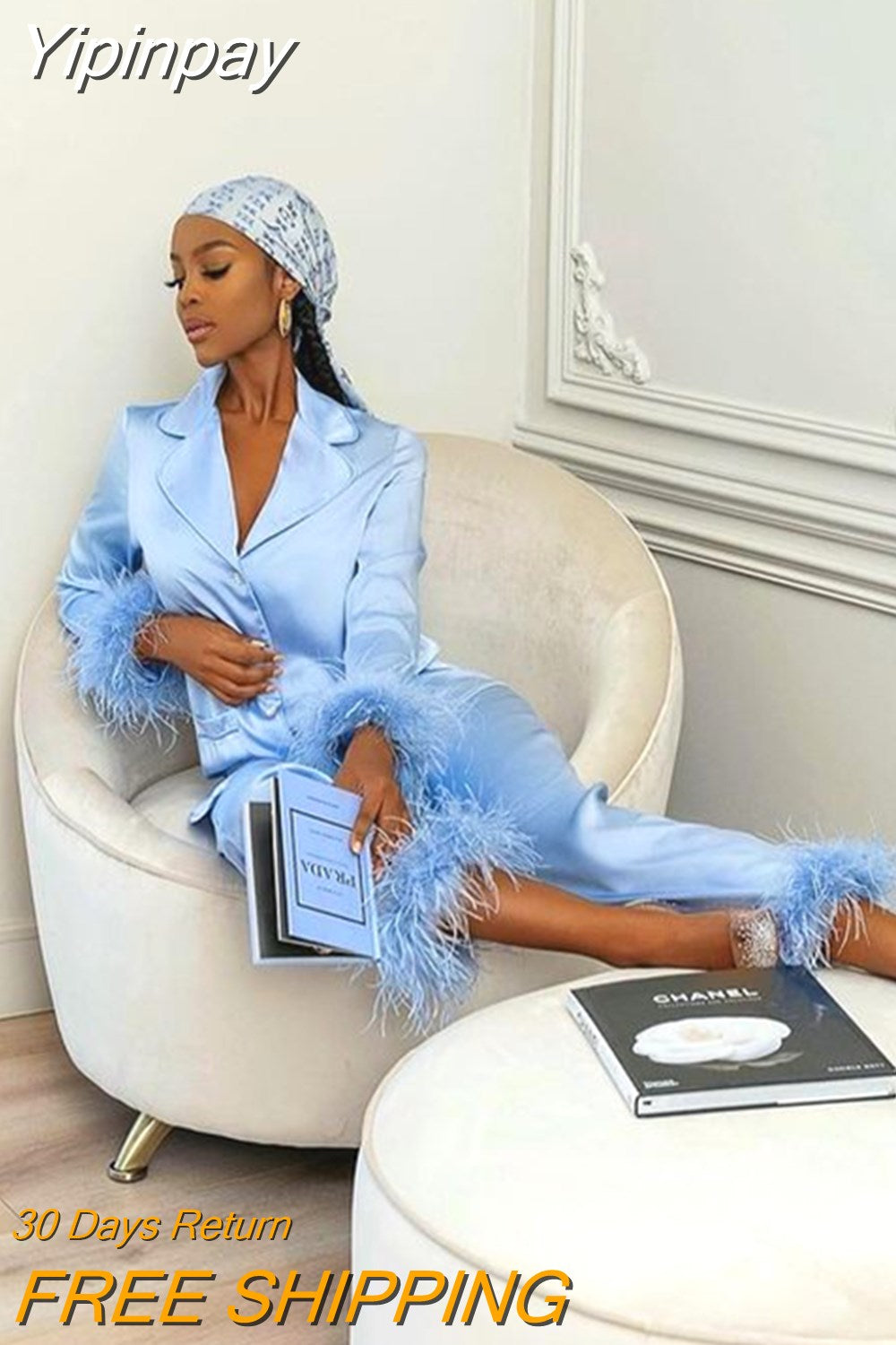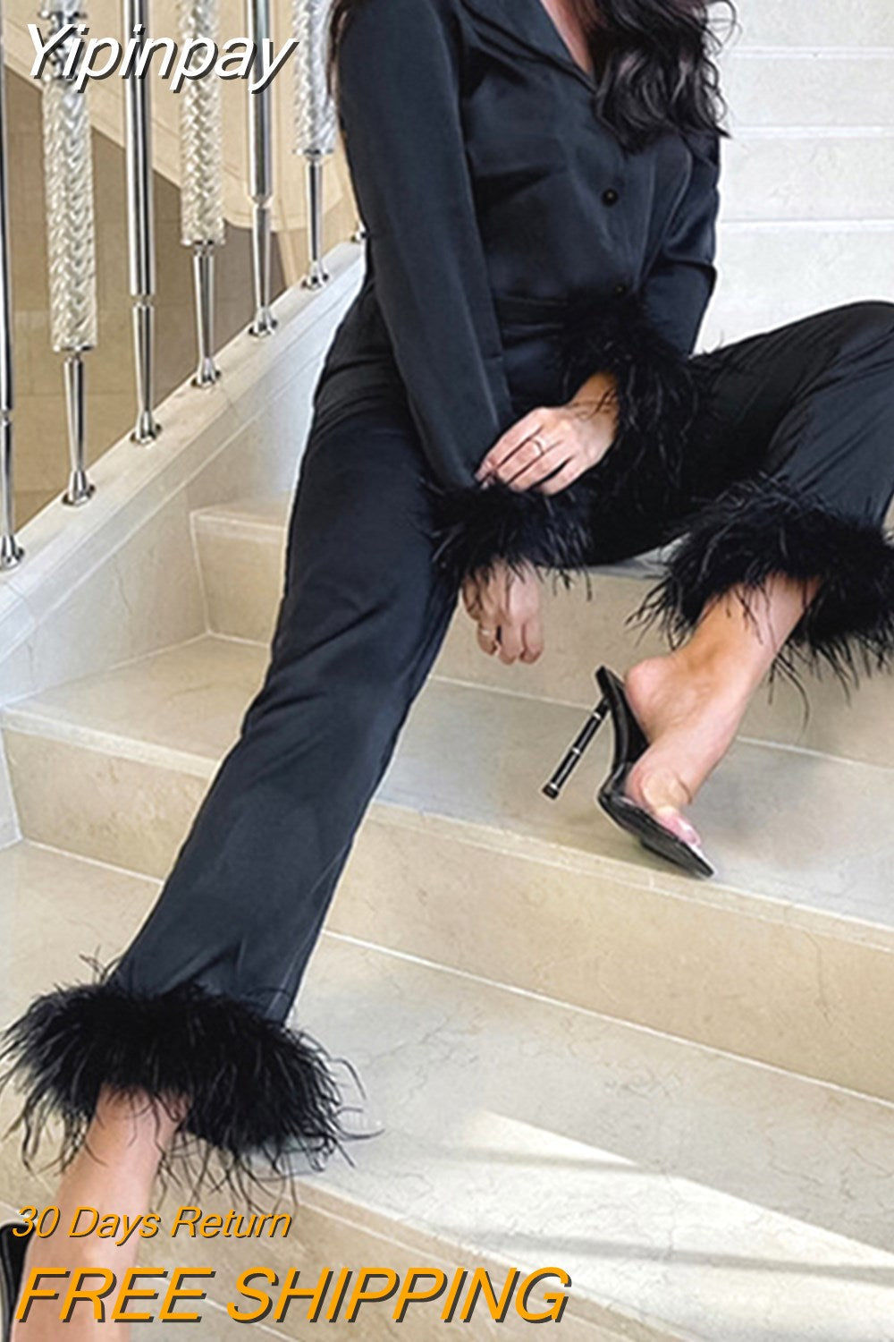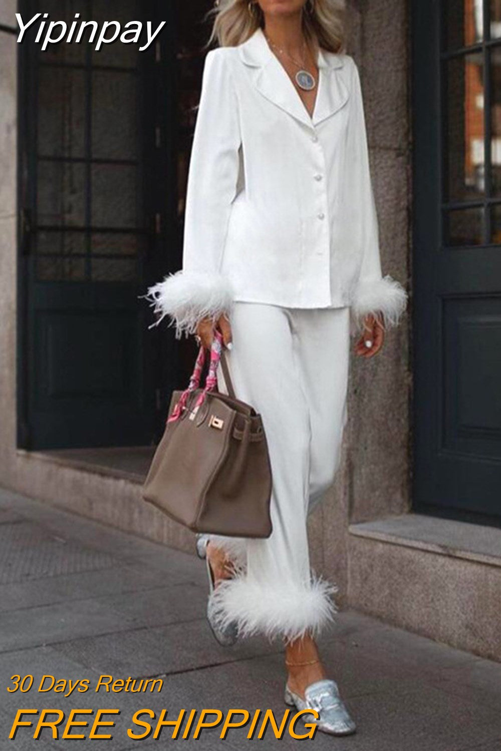 Yipinpay 2 Pcs Women Solid Color Outfits Adults Furry Long Sleeve Tailored Collar Blazer + Straight-Leg Suit Pants Street Style