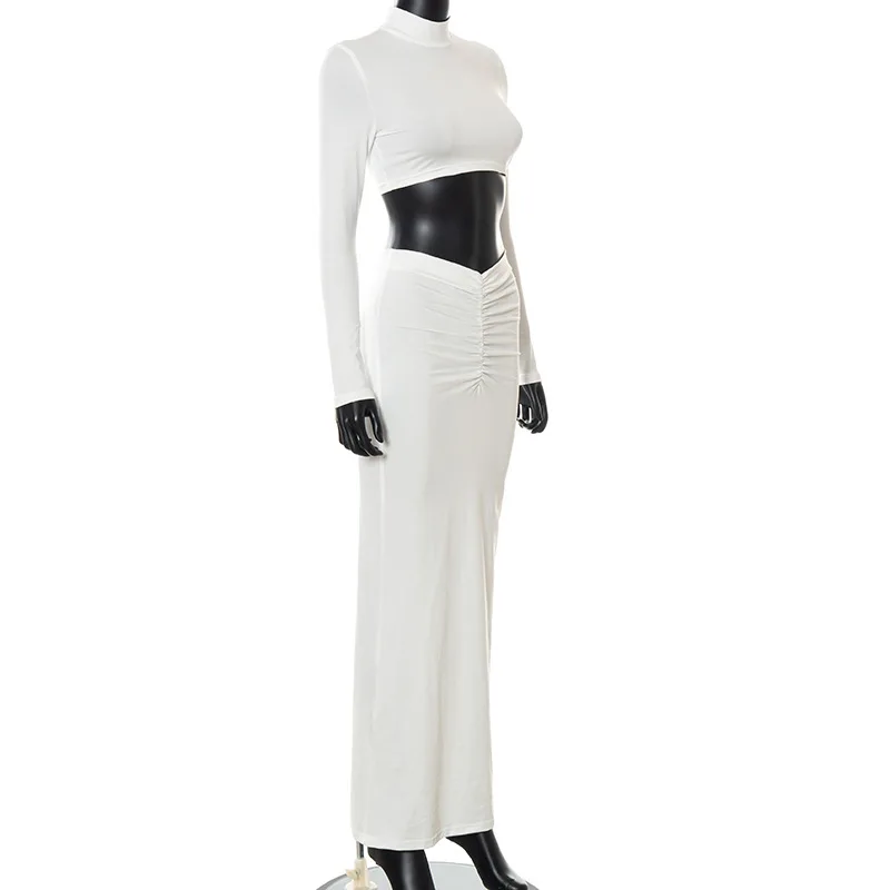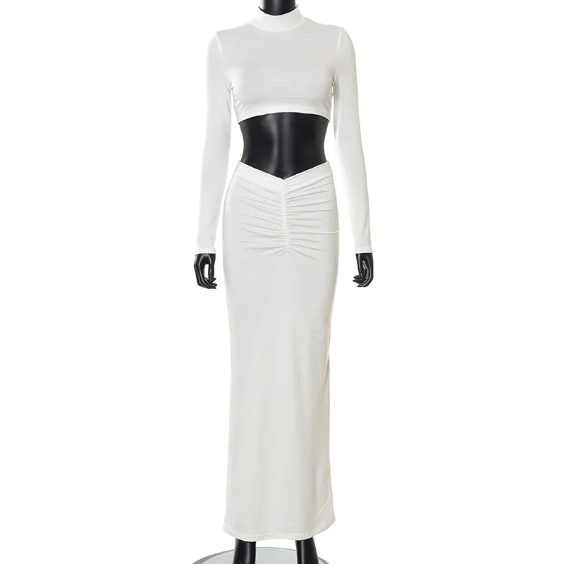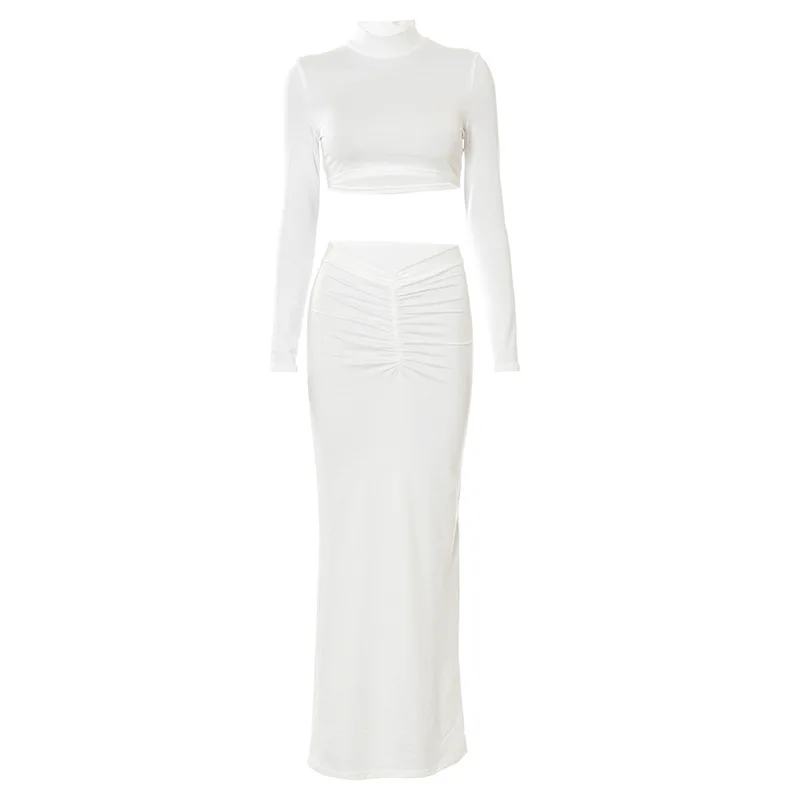 Yipinpay 2 Piece Set Outfits for Women Club Party Top and Dress Sets Elegant White Long Sleeve Long Ruched Matching Sets maxi skirt