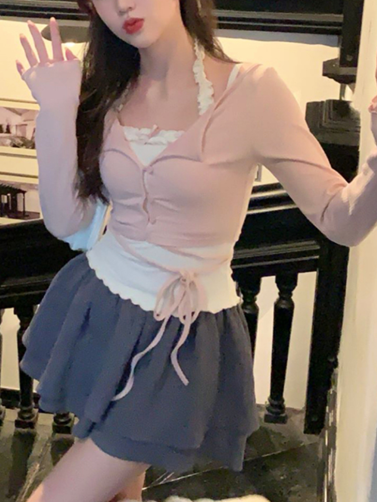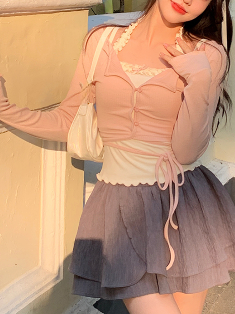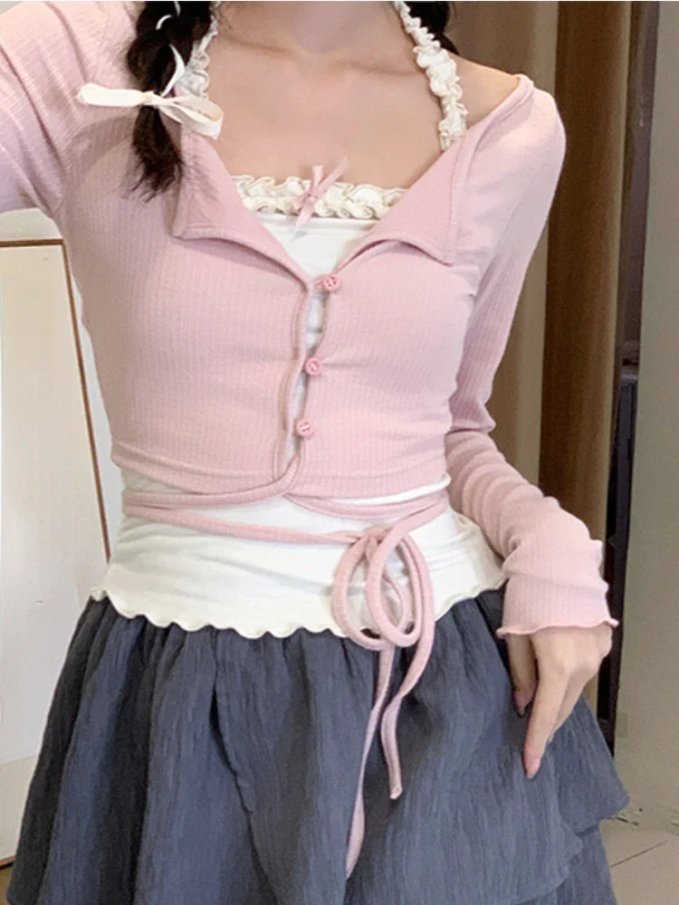 Yipinpay 2 Piece Set Woman Pink Long Sleeve Fashion Tops Basic Casual Korean Style Blouse Design Kawaii Clothing 2024 Summer Chic