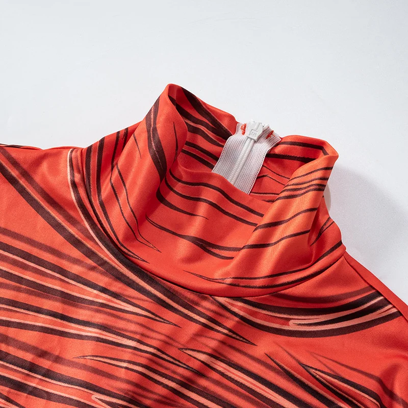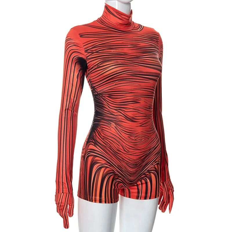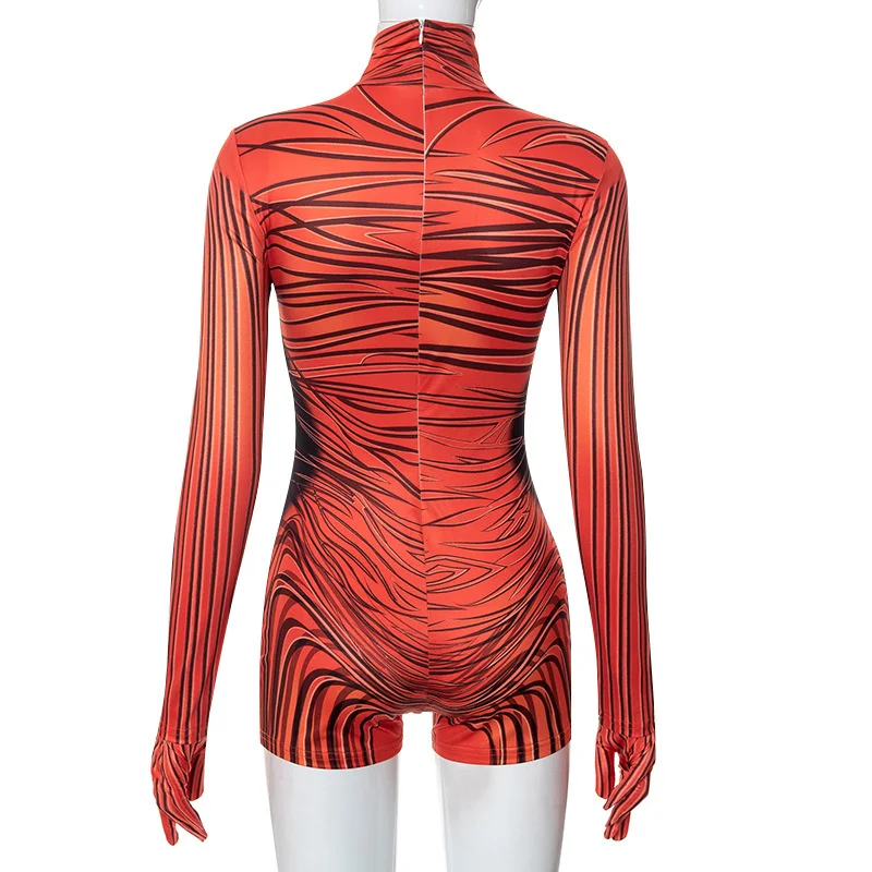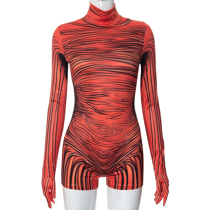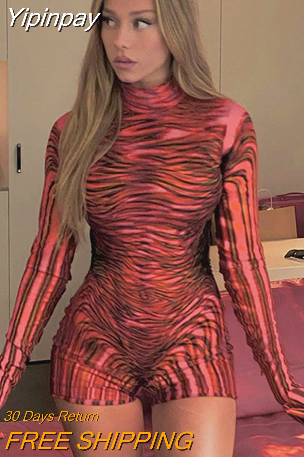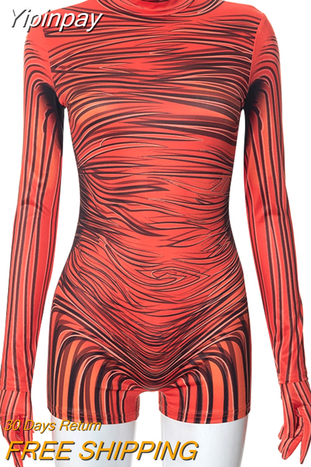 Yipinpay 2023 Autumn 3D Pattern Bodysuit+Gloves 2 Piece Sets Combinaison Femme Nightclub Zipper Slim Sexy Y2k Women Jumpsuit