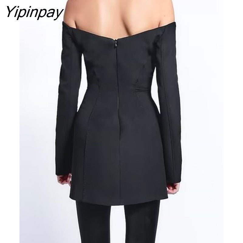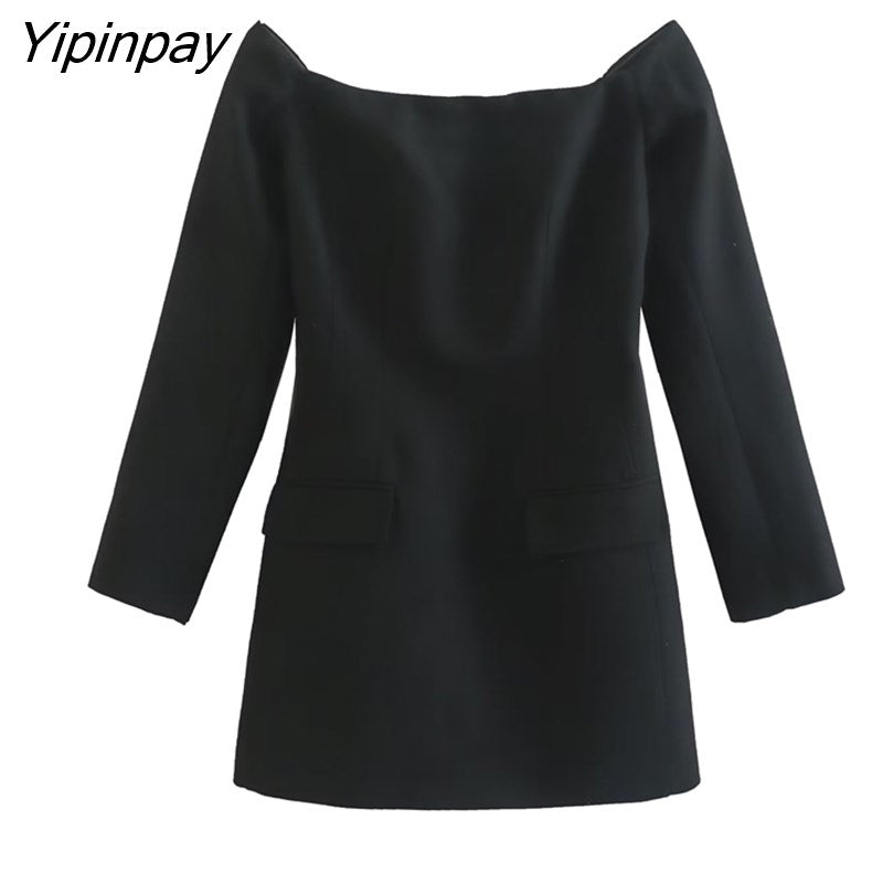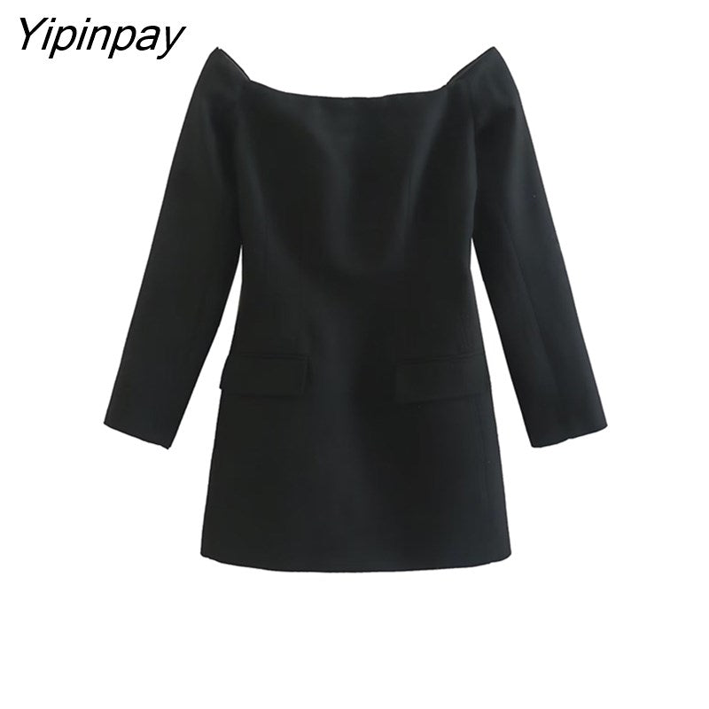 Yipinpay 2023 Autumn Ladies Sheath Mini Dresses Elegant Slash Neck Off Shoulder Party Dresses Vintage Pockets Long Sleeve Vestidos
