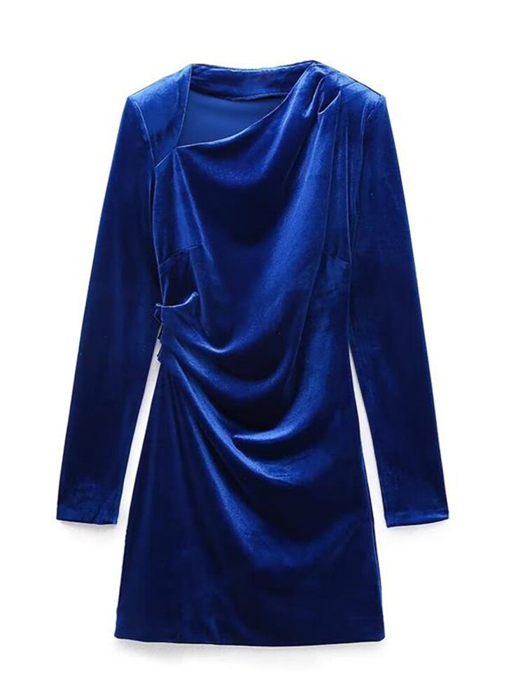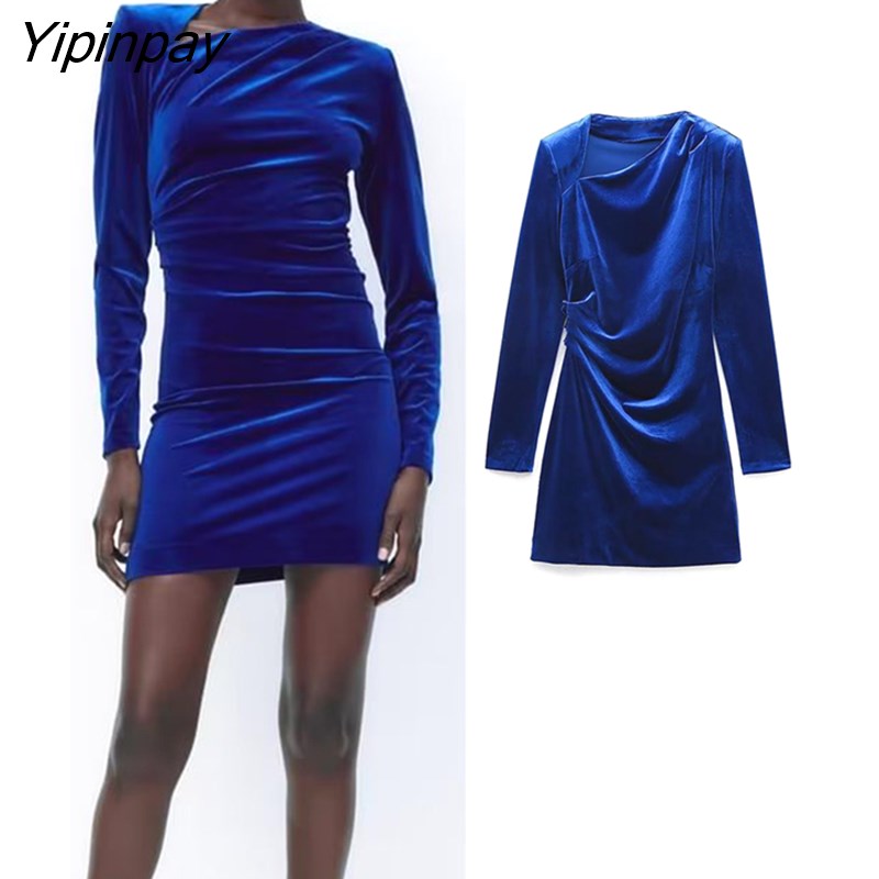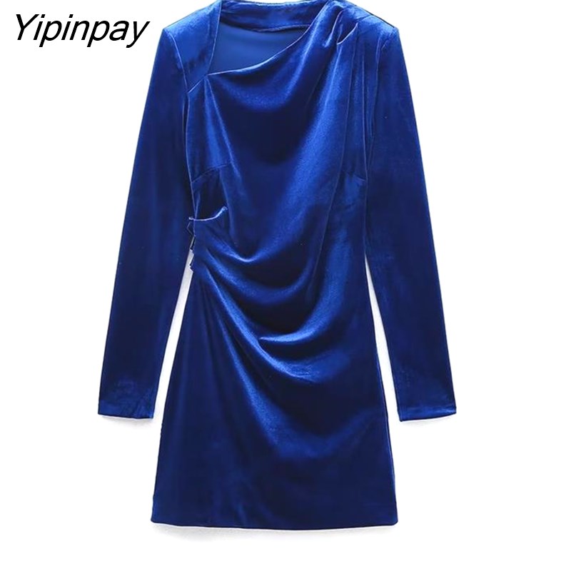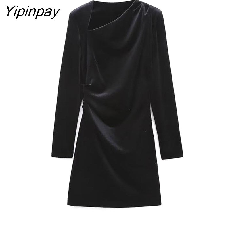 Yipinpay 2023 Autumn Ladies Velvet Mini Dresses Elegant Diagonal Collar Folds Dresses Vintage Simple Long Sleeve Vestidos