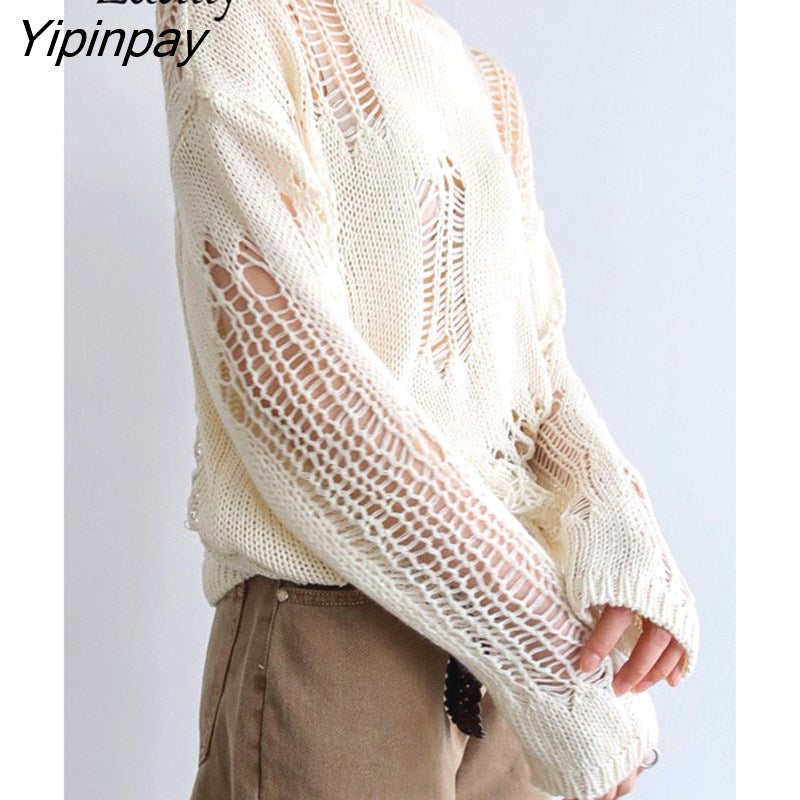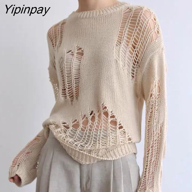 Yipinpay 2023 Autumn Long Sleeve Sweater Women Streetwear Hollow Out Loose O-Neck Ladies Knit Pullover Winter Female Clothing Tops 0406