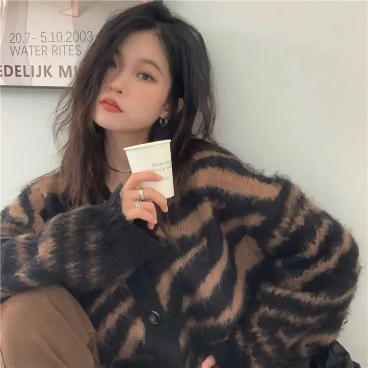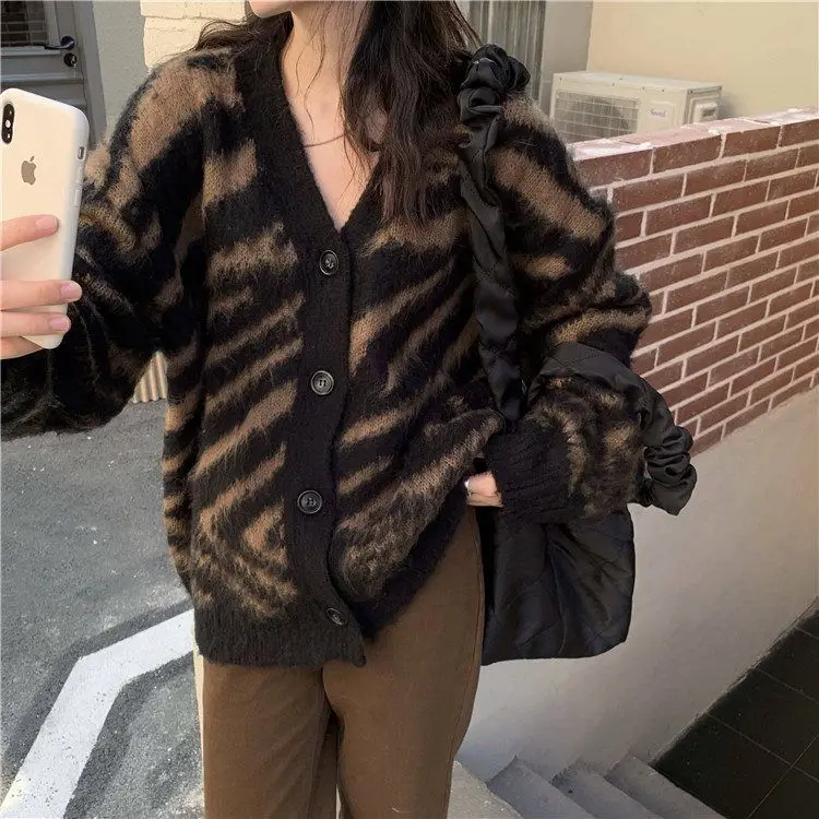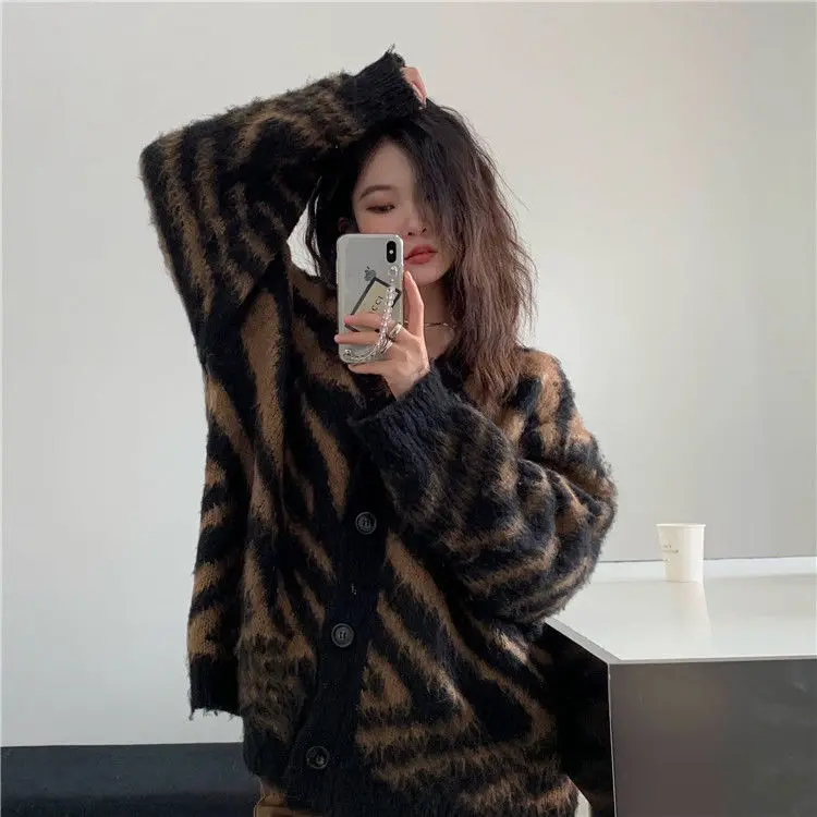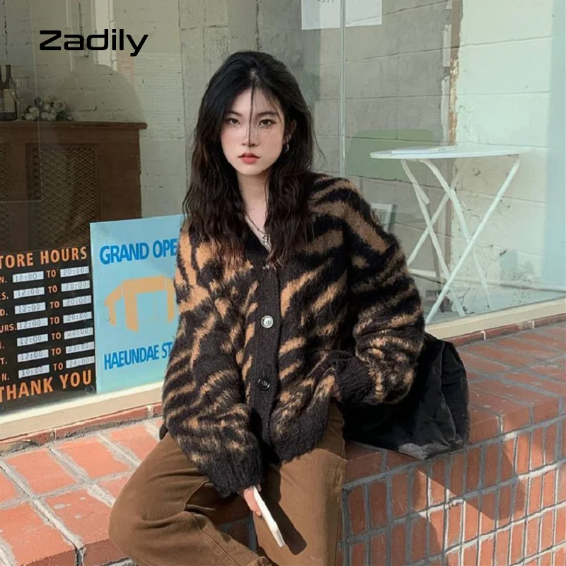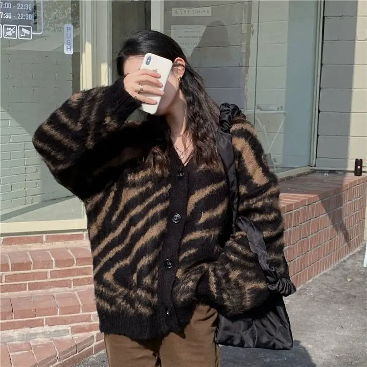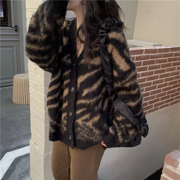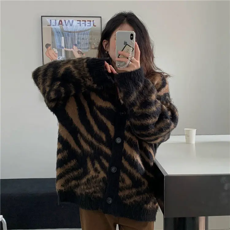 Yipinpay 2023 Autumn Street Style Zebra pattern Knit Women's Sweater Y2K Button Up Loose Long Sleeve Cardigan Coat Winter Outwear